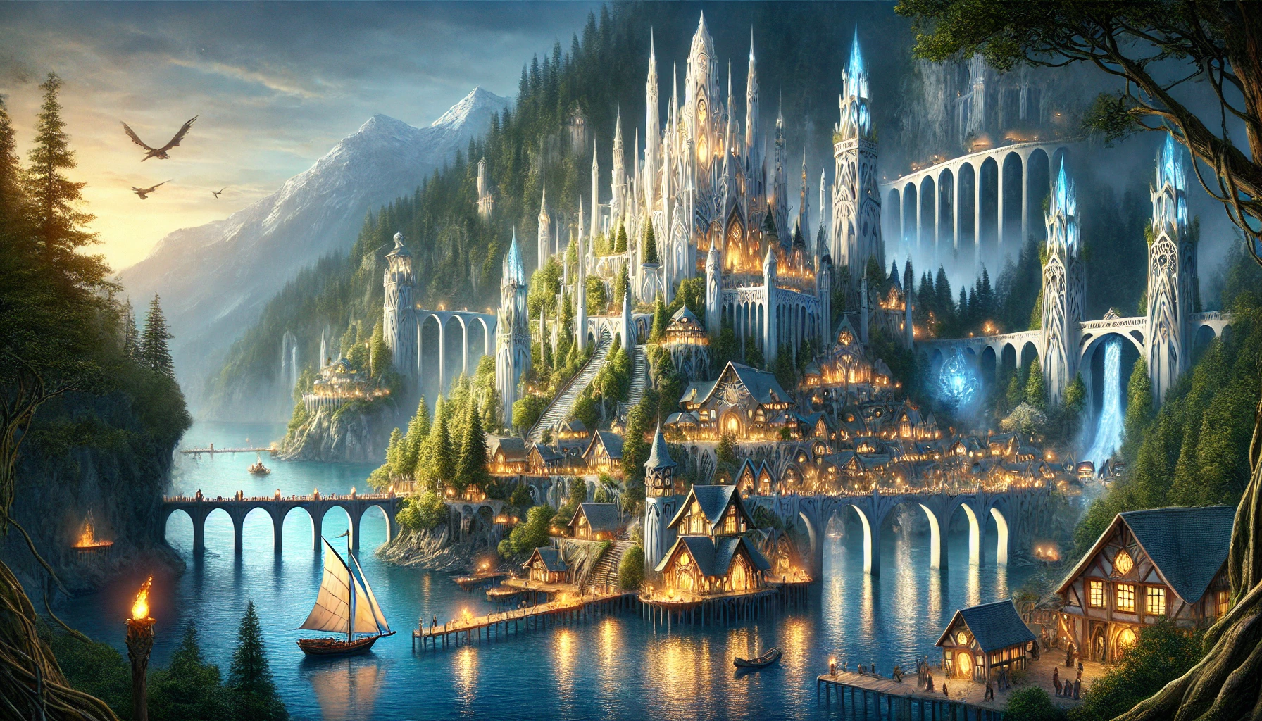 Architecture et ambiance. Elyndor se distingue par son architecture organique, alliant la pierre blanche, le bois d’argent et le cristal enchanté. Les palais royaux et les académies s’élèvent en flèches élancées incrustées de gemmes luminescentes, tandis que les maisons des habitants s’intègrent dans les collines boisées, formant un ensemble harmonieux et sans dissonance. Le port d’Elyndor est unique : plutôt que de simples quais, les navires accostent à des arches de corail vivant et des pontons tissés de racines enchantées qui s’étendent dans la mer. Les elfes n’utilisent pas de grands navires de guerre, mais leurs flottes d’ivoryns — des vaisseaux effilés, mi-bois mi-magie, capables de fendre les flots avec une rapidité surnaturelle — sont craints et respectés sur la Mer de Cristal. L’ambiance d’Elyndor est marquée par le calme et la majesté : chants lointains résonnant des terrasses, harpes cristallines jouées au crépuscule, et senteurs de fleurs marines et sylvestres. Pourtant, sous cette sérénité, vibre une vigilance constante, reflet de la mémoire douloureuse de Gar-Galad.
