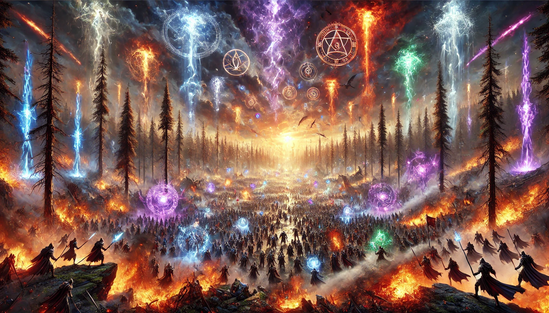 L’Invasion de Fëanaril (1891 2A). L’assaut débuta lorsque les armées conjointes traversèrent la Forêt de Fëanaril,forêt sacrée de Fëanaril, berceau de la magie elfique. Arbres vivants, esprits sylvestres et druides se dressèrent pour ralentir l’avancée, mais Maryndrae invoqua un voile d’ombre corrompant la forêt et neutralisant les enchantements protecteurs. Les orques incendièrent les clairières sacrées et massacrèrent les gardiens sylvestres, annonçant l’inéluctable siège de Gar-Galad. Le Siège de Gar-Galad (début 1892 2A). La capitale elfique fut encerclée pendant plusieurs mois. Les mages elfiques érigeaient d’immenses barrières de lumière, et les guerriers défendaient chaque tour et chaque pont. Les druides invoquèrent la faune et les racines pour écraser les envahisseurs. Mais face à eux, Maryndrae déchaînait des abîmes de ténèbres, et Gorla’ak menait ses troupes avec une brutalité inarrêtable. Les combats devinrent titanesques, où chaque victoire semblait coûter une part de la cité. La Mort d’Elandariel. Le tournant survint lorsque la déesse Elandariel, protectrice de Fëanaril, affronta Gorla’ak dans un duel épique. Elle blessa le seigneur orque, mais, affaiblie par les rituels d’ombre de Maryndrae, fut terrassée par la hache de guerre de son ennemi. Sa chute provoqua une onde de choc qui désactiva les défenses magiques de la cité. Les murailles, jadis inviolables, s’effondrèrent partiellement, ouvrant les portes à l’invasion. Le Rituel du Crépuscule. Maryndrae, avide de domination, entreprit alors un rituel funeste au cœur de la cité. Puisant dans l’essence corrompue de la forêt et les âmes des milliers de morts, elle déchira le tissu de la réalité. Le sol se transforma en marais putrides, l’air se chargea d’une brume empoisonnée, et des créatures abominables naquirent des cadavres des orques et des elfes. Même ses alliés furent frappés : des légions orques se muèrent en monstruosités, et les drows furent eux-mêmes marqués par cette corruption. La Chute de Gar-Galad. Au printemps de 1892 2A, Gar-Galad tomba définitivement. Ses tours s’écroulèrent, ses bibliothèques brûlèrent, et ses temples furent profanés. Les survivants, guidés par Celebreth, fille du roi Témérion, s’enfuirent à travers les flammes et la corruption, sauvés par l’intervention de la dracosire Thaliakaera. Ce fut la fin d’un âge, et le début de l’errance pour les elfes. Conséquences et Héritage. Gar-Galad devint un champ de ruines hantées, noyé dans une magie instable. Les Marais du Crépusculeremplacèrent les forêts bénies, grouillant de spectres, de créatures corrompues et de failles magiques mortelles. Les rares aventuriers à s’y aventurer parlent de chants fantomatiques et d’une cité qui semble encore vivante, défendant ses secrets contre les intrus. L’Exil et la Renaissance. Les survivants elfes, menés par Celebreth, fondèrent plus tard Sylvareth, un nouveau royaume insulaire, sanctuaire des traditions et des mémoires de Gar-Galad. Mais cette renaissance ne fit qu’accentuer leur ressentiment envers les humains et les nains, accusés de ne pas être intervenus dans leur heure la plus sombre. Importance Historique. La Guerre du Crépuscule est considérée comme l’un des plus grands cataclysmes du Deuxième Âge. Elle marqua la fin de Gar-Galad, joyau des elfes, la mort d’Elandariel, dernière intervention directe de la déesse dans le monde mortel, la naissance des Marais du Crépuscule, lieu maudit et symbole de la corruption magique, ainsi qu'à l’exode des elfes, menant à la fondation de Sylvareth. Mémoire et Légendes. Aujourd’hui encore, bardes et érudits relatent la Guerre du Crépuscule comme une tragédie fondatrice. Les elfes en font un chant funéraire et une mise en garde contre la convoitise. Les humains et les nains y voient un avertissement sur les excès de la magie. Quant aux aventuriers, ils la considèrent comme une légende vivante, un défi que peu osent relever : explorer Gar-Galad, la cité déchue qui refuse de mourir.