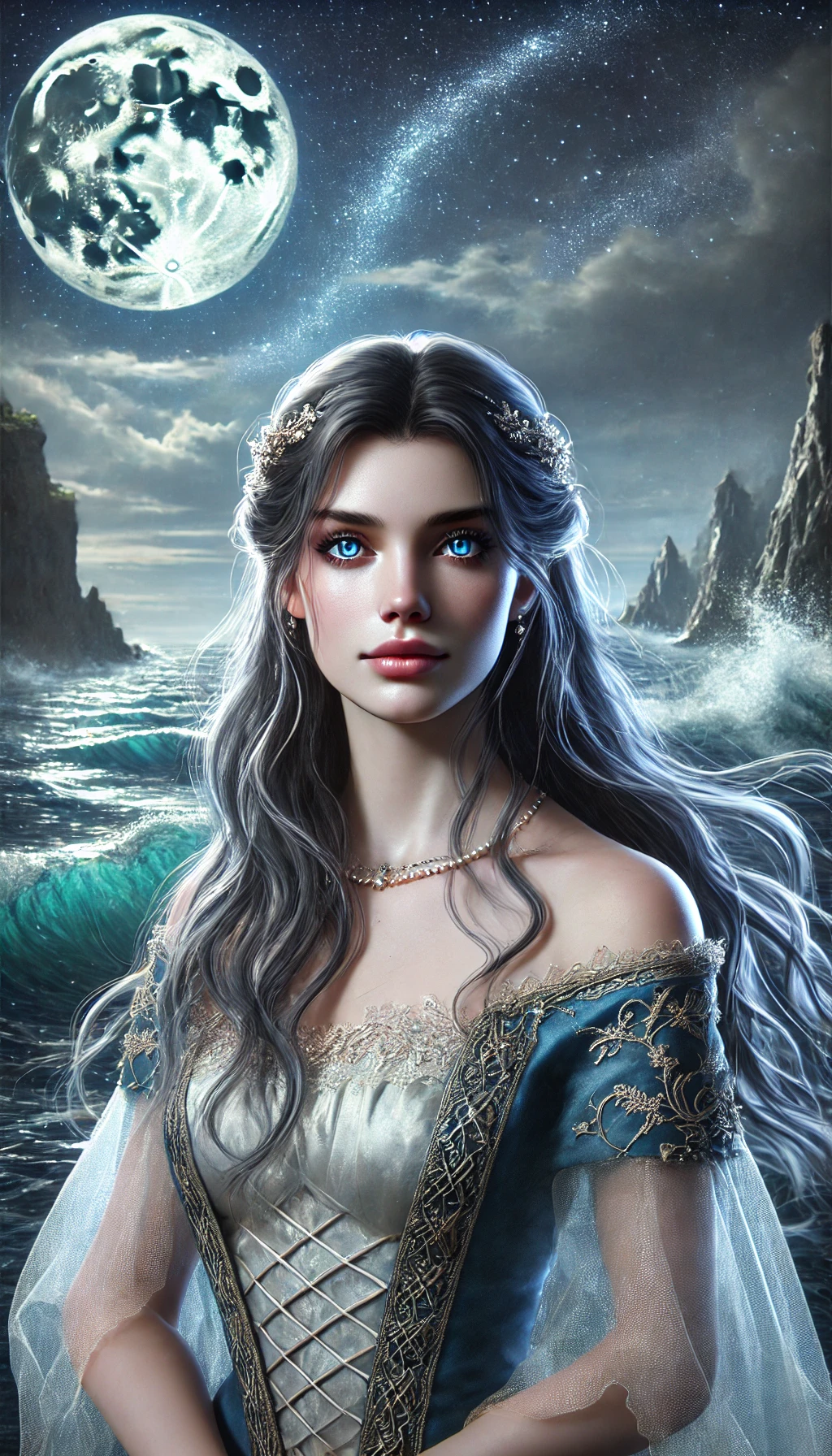 Apparence. Isorya est d’une beauté éthérée. Sa peau pâle est illuminée par une lueur naturelle, presque surnaturelle, qui rappelle l’éclat de la lune sur l’eau. Longs et argentés, ses cheveux semblent toujours légèrement ondulés, comme s’ils avaient été caressés par la brise marine. Ses yeux d’un bleu cristallin évoquent les profondeurs insondables de l’océan. Elle préfère des robes fluides et élégantes, souvent ornées de motifs aquatiques, comme des coquillages, des vagues ou des perles, rappelant son affinité avec l’eau et la magie.