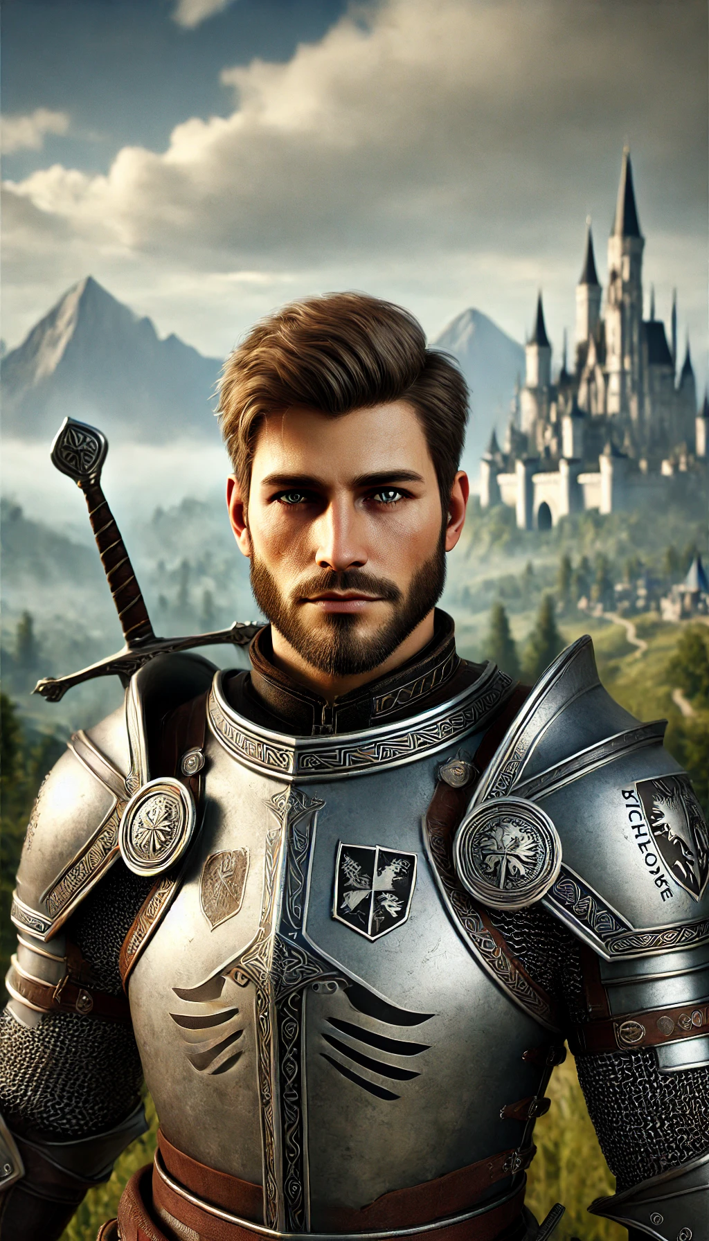 Description et apparence. Kaelric est un homme de 25 ans, de haute stature (près de 1,90 m), à la carrure robuste forgée par des années d’entraînement et de batailles. Ses épaules larges et son maintien martial rappellent qu’il a grandi l’épée à la main. Ses cheveux châtains clairs sont généralement coupés courts, bien qu’il laisse pousser une barbe soignée qui accentue ses traits carrés. Ses yeux gris, presque métalliques, reflètent une énergie farouche et une détermination sans faille. Kaelric porte souvent une armure d’acier finement ouvragée, ornée des armoiries de Valusia. Sur le champ de bataille, il manie une épée bâtarde qu’il appelle Éperon, héritée de son grand-père, ainsi qu’un bouclier rectangulaire gravé de runes de protection offertes par les nains de Richeforge.
