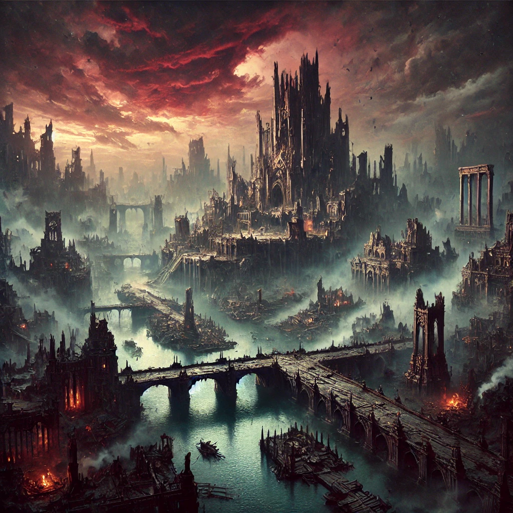 État Actuel des Ruines. Aujourd’hui, Kaeltharn n’est plus qu’un vestige hanté de son ancienne grandeur. La cité est en ruine, ses bâtiments calcinés et envahis par la végétation sombre. Les anciennes avenues pavées sont brisées, couvertes de cendres et de poussière, tandis que des statues de héros tombés sont fissurées, parfois méconnaissables.