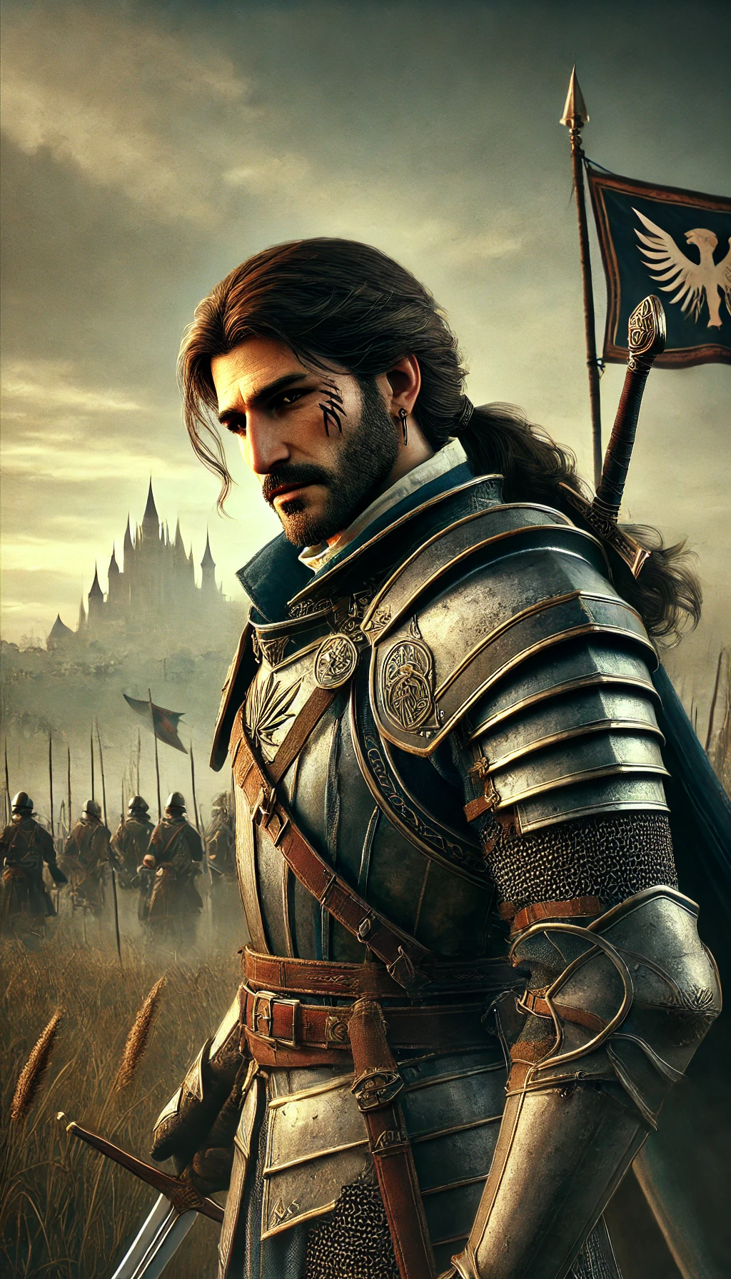 Kalédar est un homme de grande stature, bien qu’il soit plus musclé et moins imposant que son frère Kalédos. Sa chevelure brune est plus longue, souvent attachée en queue de cheval ou en tresse pour ne pas gêner ses mouvements lors des combats. Son visage est marqué par quelques cicatrices de guerre, témoignant de ses nombreuses batailles. Ses yeux sombres dégagent une intense détermination, mais sont également empreints de compassion et de sagesse. Il porte généralement des armures de plate pratiques mais élégantes, adaptées à la fois à la protection et à l’agilité requise dans le combat.