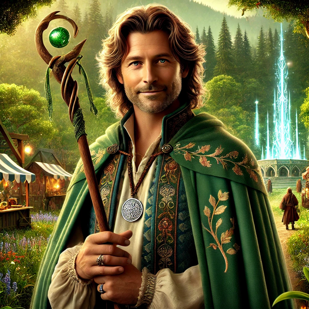 Keldir est un homme d'une quarantaine d'années, au visage marqué par les années mais rayonnant d’une chaleur bienveillante. Son teint est légèrement hâlé, témoignage de ses nombreuses journées passées à marcher dans le village et à discuter avec ses habitants. Ses cheveux bruns parsemés de mèches argentées encadrent un visage aux traits doux, mais empreint d’une autorité naturelle. Ses yeux noisette, pétillants de sagesse et d'humour, inspirent confiance à tous ceux qui croisent son regard. Il porte des vêtements simples mais élégants, souvent ornés de broderies représentant des motifs forestiers ou aquatiques, en hommage à la Source d’Éclat. Une cape verte sombre, symbole de son rôle de bourgmestre, repose sur ses épaules.