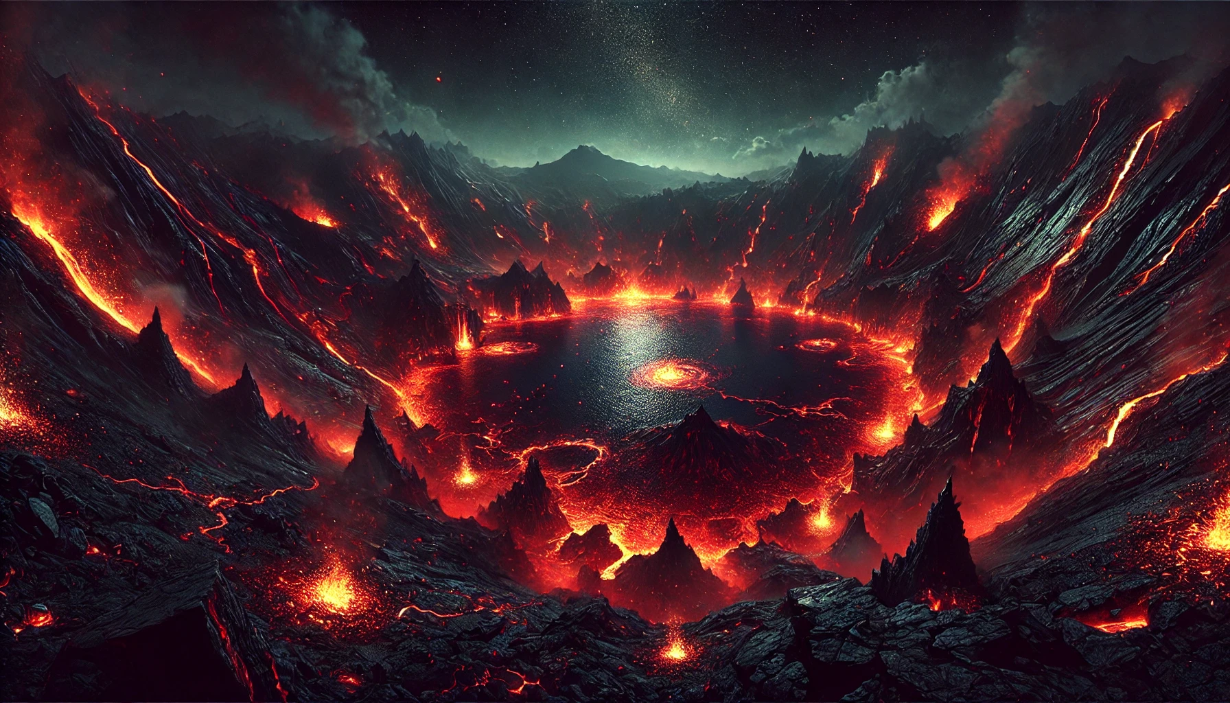 Origines et Création. Le Lac des Braises n’existait pas avant l’an 63 du Deuxième Âge. Ce fut lors de la Bataille du Ciel Écarlate, pendant la Guerre des Flammes Célestes, que son destin fut scellé. Lorsque Kaernia Valskar transperça le cœur d’Izbanrung, fille de Ktaroth, le cadavre incandescent de la dragonne s’écrasa dans un lac. Mais le corps de la créature, saturé de feu primordial, consuma instantanément l’eau et la transforma en un bassin de lave vivante, imprégné de magie destructrice. Depuis lors, le lac brûle sans jamais s’éteindre. La lave ne se refroidit jamais, car elle est entretenue par la magie du dragon défunt, dont l’essence se répand encore dans la roche et les flammes. Ainsi, le Lac des Braises est littéralement une cicatrice vivante, née du corps d’Izbanrung.
