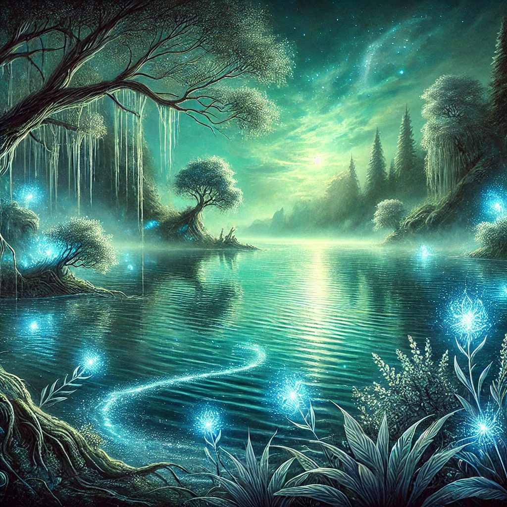 Au centre du lac, une petite île mystérieuse émerge des eaux, surmontée d’une tour en ruine de marbre blanc recouvert de lierre et de mousse luminescente. Cette île, que l'on nomme L'Île de l’Oubli, est enveloppée d'une aura de silence surnaturel, et il est dit que quiconque pose le pied sur ses rives perd la notion du temps, en proie à des visions et des rêves d’un autre monde. La tour elle-même est souvent décrite comme étant le dernier vestige d'une ancienne civilisation qui vénérait les étoiles, et certains prétendent que des secrets oubliés y sont cachés, attendant ceux qui oseraient s'y aventurer. Les créatures du lac sont tout aussi mystérieuses et captivantes. Des poissons aux écailles d’argent et d’or glissent sous la surface, émettant de faibles lumières qui illuminent les eaux sombres. Des nymphes aquatiques, appelées Les Veilleuses, habitent le lac, se manifestant sous forme d’ombres élégantes qui dansent au clair de lune. Les légendes racontent qu’elles sont les gardiennes du lac, capables de chanter des mélodies qui endorment quiconque les entend ou de révéler des vérités profondes à ceux qui cherchent la sagesse.