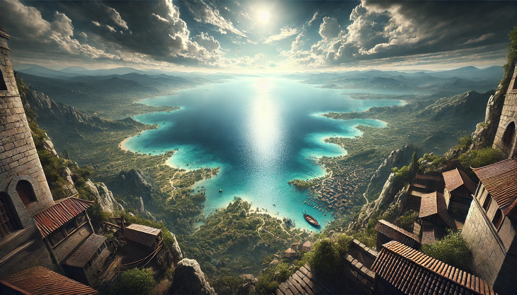 Dangers et menaces. Bien que le lac soit généralement sûr, il est auréolé de mystères et de récits inquiétants. Les pêcheurs racontent l’existence de créatures anciennes, comme le Leviarion, un serpent aquatique géant qui dormirait dans ses abysses. De violentes tempêtes magiques, surgissant parfois sans prévenir, sont perçues comme des colères divines ou comme des échos d’une magie ancienne encore tapie dans ses profondeurs. Enfin, des bandits et contrebandiers utilisent certaines criques isolées pour se cacher, profitant de la vastitude du lac pour échapper aux patrouilles.