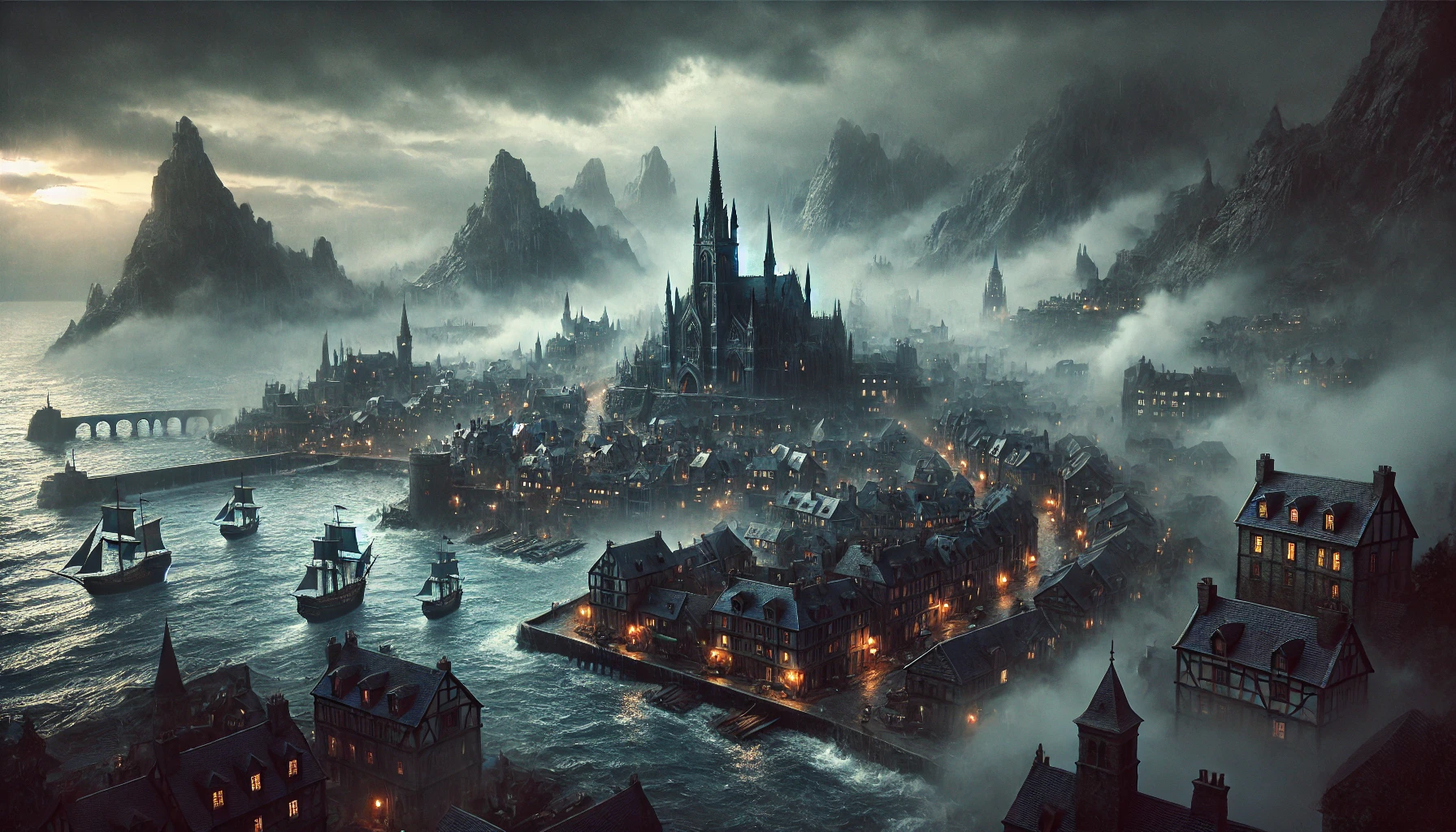 Bien que de petite taille, Larmegrise est une cité impénétrable et inquiétante. Les remparts de la ville, bien qu’usés par les siècles, offrent une protection efficace contre toute invasion. La ville se divise en deux zones principales : le port, cœur économique de la ville, et la ville fortifiée où résident les élites et la Comtesse. Le port de Larmegrise, bien que très actif, est marquée par une brume constante et un air lourd, comme si l’atmosphère elle-même respirait un mal ancien. Les rues étroites et tortueuses sont bordées de bâtiments de pierre noire, souvent surmontés de toits d’ardoise usée. Des enseignes de bois grincent dans le vent, et la lueur des lanternes jette des ombres inquiétantes. Le centre de la ville abrite une grande place où se dresse le château de la Comtesse, un monument imposant, au sommet d’une colline, qui domine la ville. Dans les bas-fonds de la ville, les tavernes sont pleines de murmures, les habitants chuchotent des rumeurs d’événements surnaturels. Les échos des anciennes malédictions semblent hanter la ville, et même les plus sceptiques ne peuvent ignorer l’aura de terreur qui émane des rues après la tombée de la nuit.