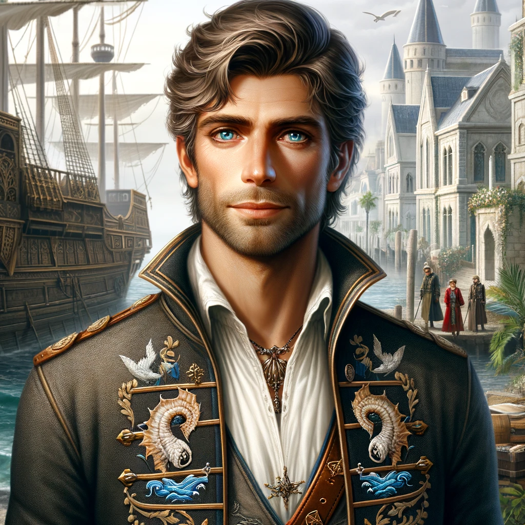 Doté d'une allure imposante, il porte des vêtements élégants mais pratiques, souvent agrémentés d’éléments marins, comme des broderies en forme de vagues ou de coquillages. Ses yeux bleu-océan et ses cheveux bruns légèrement grisonnants témoignent des années passées en mer.