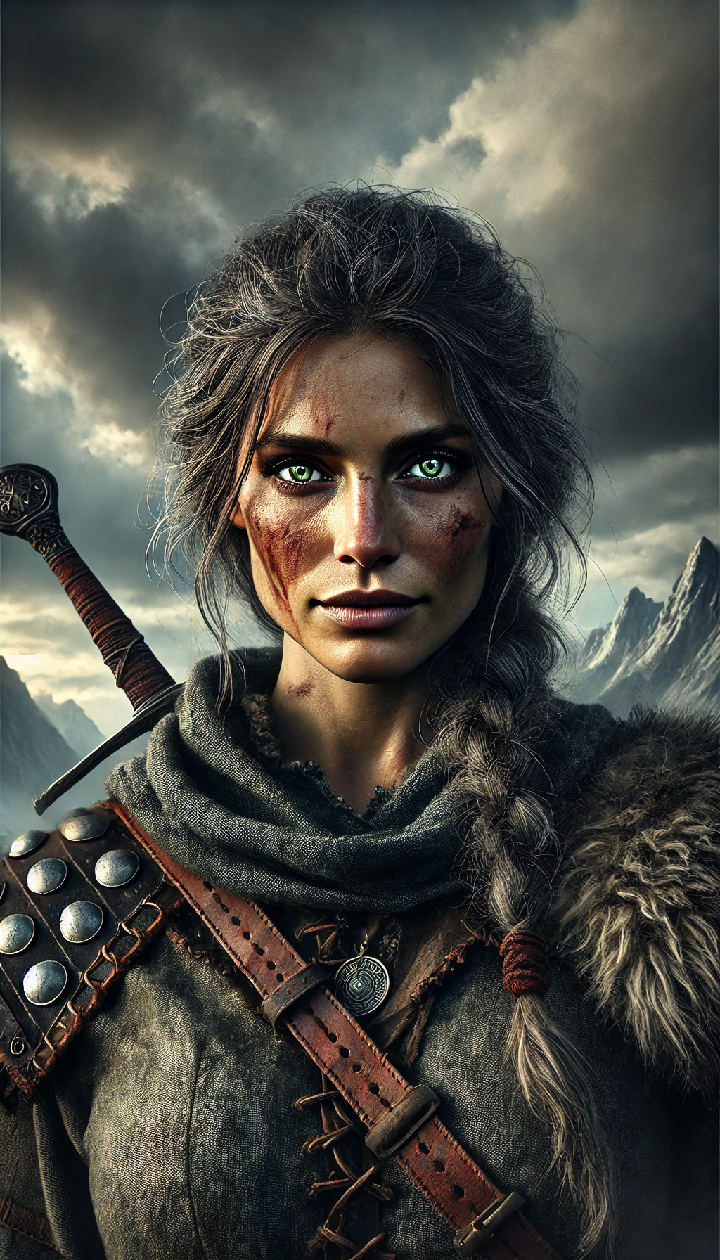 Apparence. Maelis possède une stature robuste, héritée des travaux manuels de sa jeunesse. Sa peau est tannée par le soleil et durcie par le vent des montagnes, marquée de cicatrices et de brûlures superficielles laissées par les incendies. Ses cheveux, poivre et sel, sont généralement attachés en une longue tresse qu’elle glisse sous un foulard sombre taché de suie. Ses yeux d’un vert intense, toujours en alerte, semblent refléter le souvenir de flammes passées et la crainte vigilante d’un nouvel assaut. Elle porte des vêtements simples mais solides, faits de laine et de cuir épais, souvent renforcés de plaques de métal légères pour se protéger en cas d’attaque. Elle porte toujours une épée longue spécialement enchantée pour affronter les dragons rouges.