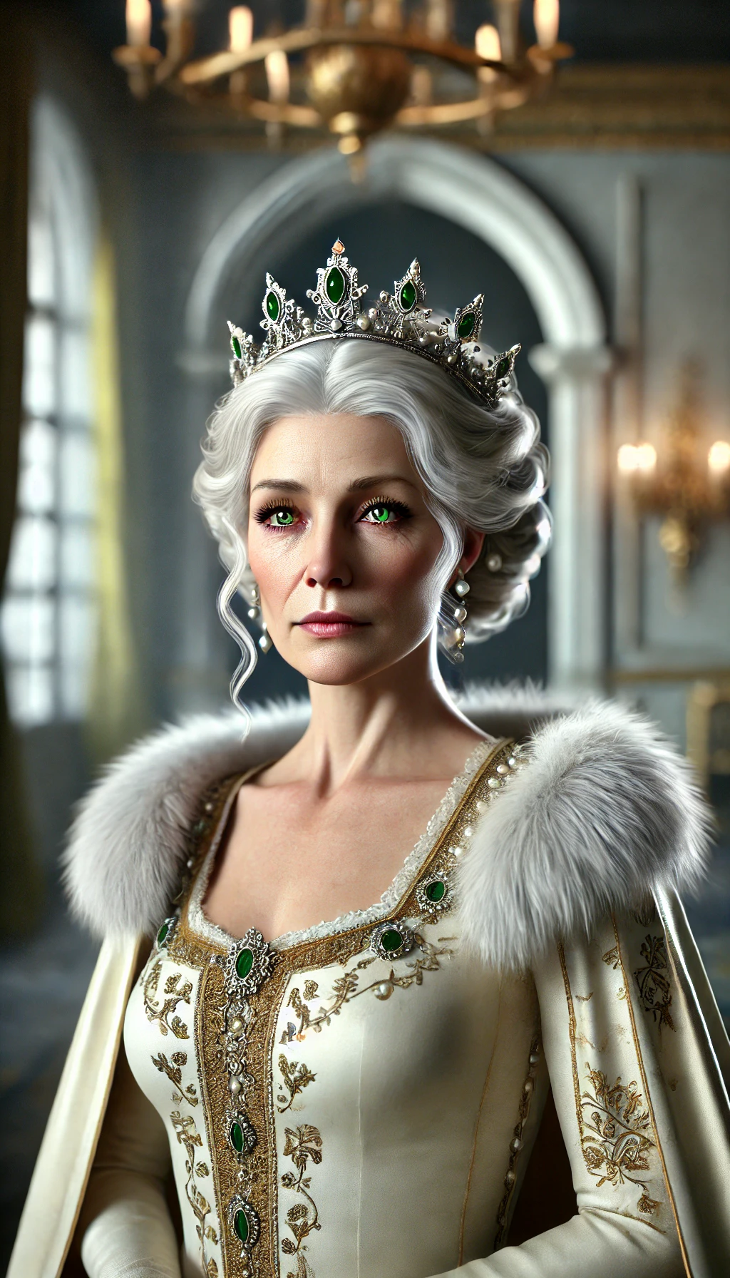 Description et apparence. La reine Maerynna Alamontyr est une femme d’une grâce intemporelle, dont la prestance inspire le respect autant que l’admiration. Bien qu’approchant des soixante-dix ans, elle conserve une beauté noble et austère, rehaussée par une aura de sérénité. Sa chevelure blanche, autrefois d’un blond lumineux, est portée en coiffures élaborées serties de perles et d’épingles d’argent. Ses yeux d’un vert pâle, presque translucides, rappellent ceux de ses ancêtres Valenyr et semblent toujours observer au-delà des apparences. Elle préfère les robes sobres mais majestueuses, faites de soie blanche ou d’albâtre brodée d’or fin, souvent accompagnées d’un manteau d’hermine. En public, elle porte une tiare simple en argent incrustée d’émeraudes, symbole de son rôle de reine consort.