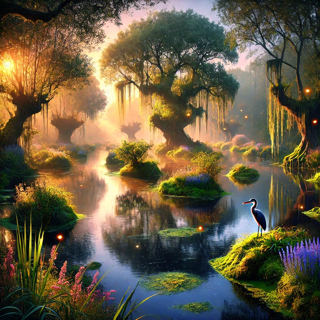 Faune et Flore. Le marais regorge de vie et offre un refuge à de nombreuses espèces rares. Parmi elles, on trouve les hérons de saphir, de majestueux oiseaux aux plumes scintillantes, ainsi que les loutres de Claire-Rive, curieuses et joueuses, qui glissent entre les nénuphars. À la tombée de la nuit, des lucioles d’azur illuminent les rives et offrent un spectacle féerique, tandis que les poissons-lumière dessinent de légers sillages phosphorescents sous la surface. La flore est tout aussi fascinante. Les lys des brumes dégagent un parfum envoûtant au lever du jour, et les chênes de l’Éther, dont l’écorce est réputée pour ses propriétés magiques, parsèment les hauteurs légèrement surélevées du marais. Les roseaux murmurent lorsqu’ils sont caressés par le vent, ajoutant une dimension presque vivante au paysage.