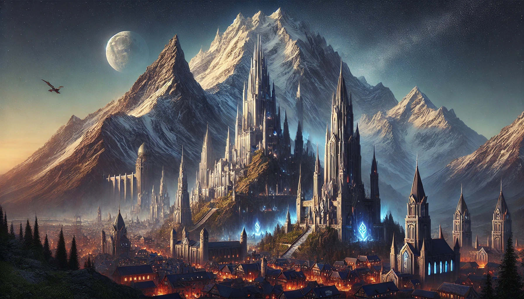 Description générale. Le Mont Valmyris est l’une des plus imposantes montagnes du Kamaralion, et sans doute l’une des plus célèbres de tout Mythrania. Il s’élève tel un colosse de pierre et de glace, atteignant près de 4 800 mètres d’altitude, dominant la vallée environnante et projetant son ombre sur la cité de Nystral, bâtie à flanc de sa façade méridionale. Sa silhouette massive se distingue par trois sommets jumeaux reliés par des arêtes abruptes, qui semblent former une couronne de pierre. Les flancs sud et est, plus accessibles, abritent terrasses naturelles, forêts de conifères et pâturages d’altitude. Le versant nord, en revanche, est une falaise vertigineuse battue par les vents, quasiment infranchissable. À mesure que l’on gravit la montagne, les pins et les bouleaux laissent place à des étendues rocailleuses couvertes de neige éternelle, puis à des rochers lumineux qui réfléchissent la lumière des lunes et des étoiles dans des éclats argentés visibles à des kilomètres.