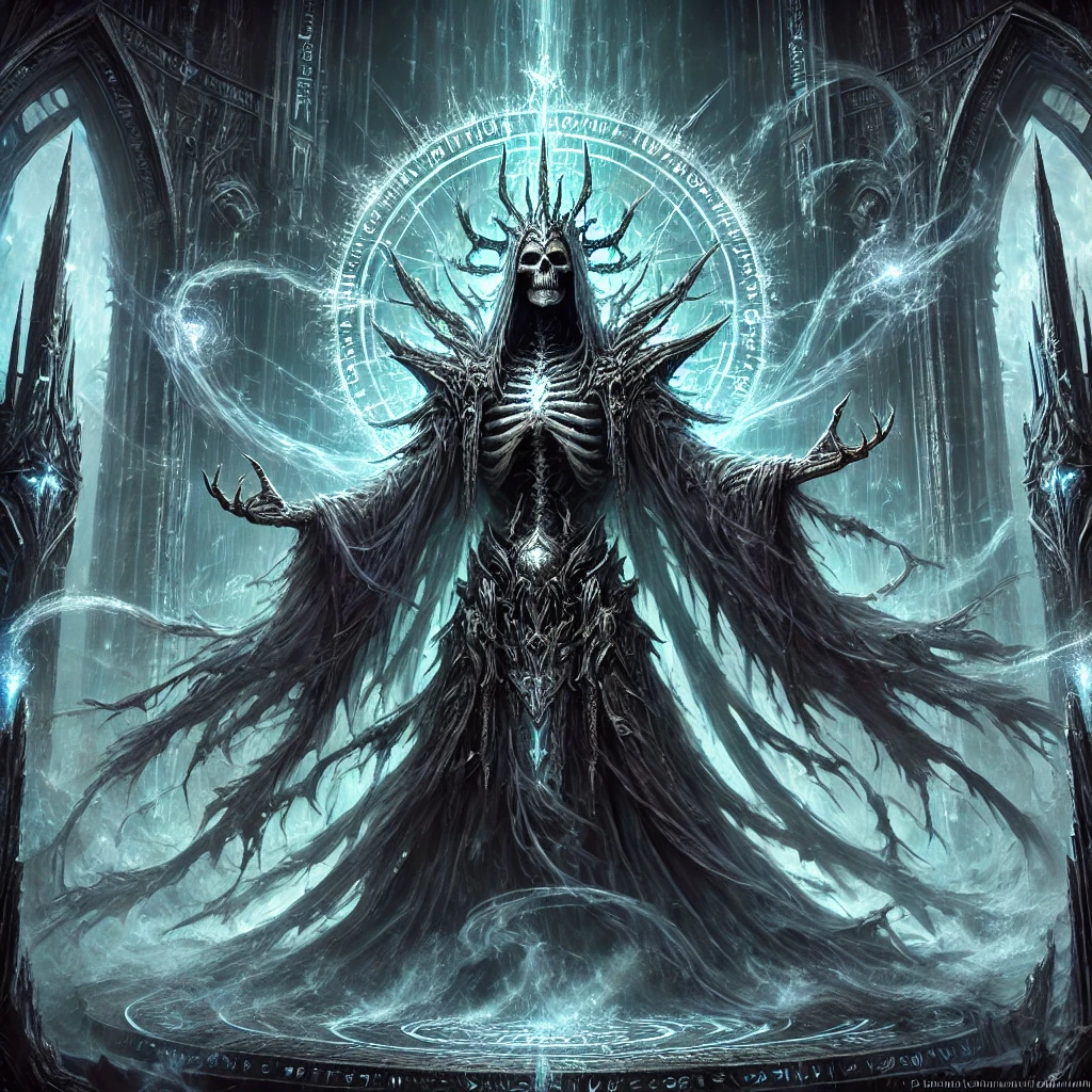 Mordikan n’est plus ce qu’il était autrefois. De son ancienne forme humaine, il ne reste plus que des morceaux de chair morte et des os rongés par les siècles. Sa peau est devenue translucide, d’une pâleur spectrale, et son corps est envahi par des tissus décomposés. Il porte des bandelettes noires enroulées autour de ses membres, signes de ses rituels de préservation. Les seuls signes de son ancienne humanité sont ses yeux, d’un noir profond, où une lumière maléfique semble pulser de l’intérieur, comme une étincelle éternelle. Sa tête est déformée par les années de mort et de réanimation. Sa mâchoire est légèrement décalée, avec des crocs pointus qui dépassent de ses lèvres. Ses cheveux ont disparu, remplacés par une couronne de runes anciennes gravées dans son crâne, des symboles d’une magie ancienne. Il est vêtu d’une robe de nécromancien noire, brodée d’argent et de symboles profanes, qui semble se fondre dans l’ombre elle-même.