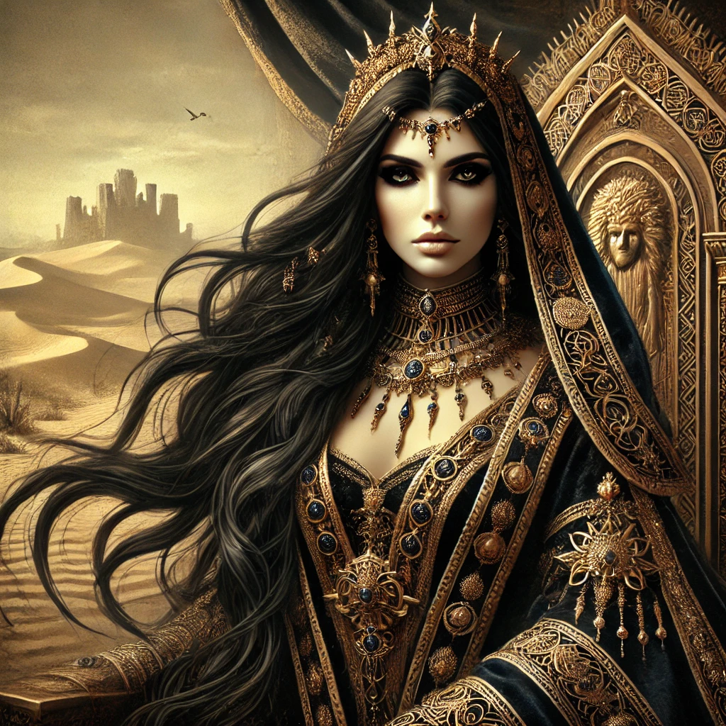 Après des années passées dans les profondeurs mystiques du désert, Mysorîs accéda au trône dans des circonstances qui demeurent floues. Certains affirment qu’elle se lia à un ancien roi mourant, absorbant son pouvoir et son héritage. D’autres parlent d’un mariage avec un souverain qu’elle aurait ensuite mystérieusement écarté. Mais ce qui est certain, c’est qu’à peine montée sur le trône, elle exerça son règne avec une sagesse impressionnante et une poigne de fer. La Reine Mysorîs sut unifier les factions divisées et établir une paix fragile mais durable, veillant sur Shar Vel-Rê comme une gardienne plus que comme une simple souveraine.