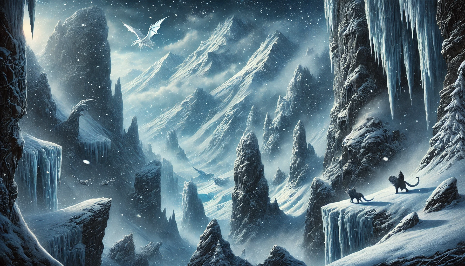 Les Pics Gelés sont une chaîne de montagnes isolée et redoutée, située au nord-est de Mythrania, à la frontière des Terres Glaciales de Grâar. Connues pour leurs tempêtes de neige incessantes et leur environnement impitoyable, ces montagnes sont une terre de légendes où seuls les plus robustes osent s’aventurer. Bien que peu accueillantes, les Pics Gelés abritent des secrets anciens, des créatures monstrueuses, et un peuple de barbares qui a su prospérer malgré les conditions extrêmes. Les Pics Gelés ne sont pas simplement un lieu de dangers et de monstres. C’est une région où la survie est un combat quotidien, où les légendes se mêlent à la réalité, et où ceux qui osent défier les éléments peuvent trouver gloire ou mort dans les neiges éternelles.