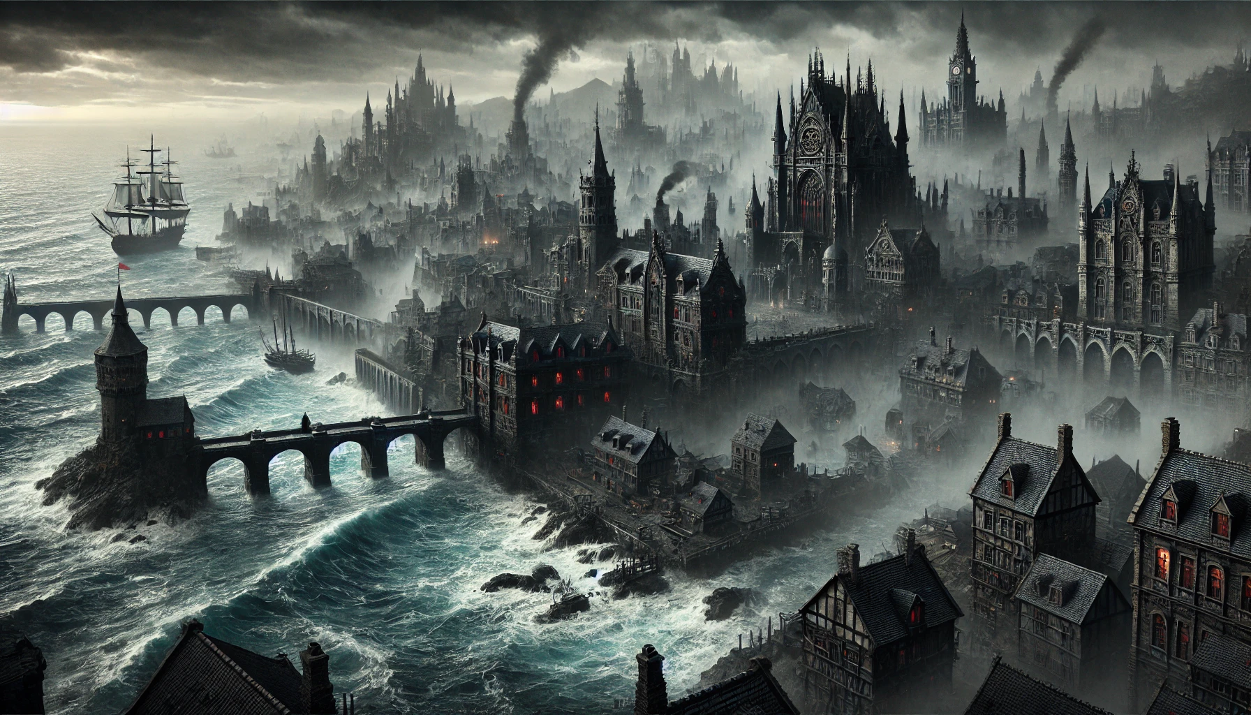 Ambiance et Architecture. La ville est enveloppée en permanence d’une épaisse brume. Les toits d’ardoise noire, les verrières teintées de rouge et les statues macabres confèrent à la ville un style gothique-ritualiste propre. Des ponts voûtés enjambent les canaux saumâtres, et de nombreuses cryptes et passages souterrains sillonnent la ville en profondeur, permettant aux puissants de se déplacer à l’abri des regards. La nuit à Rivenoire est épaisse, étouffante, silencieuse, troublée seulement par les pas feutrés des messagers, les cris étouffés des traîtres, ou le tintement discret de l’or sale. Le jour, la ville n’est guère plus accueillante : tout est jeu de pouvoir, et personne ne parle sans être sûr d’être écouté.