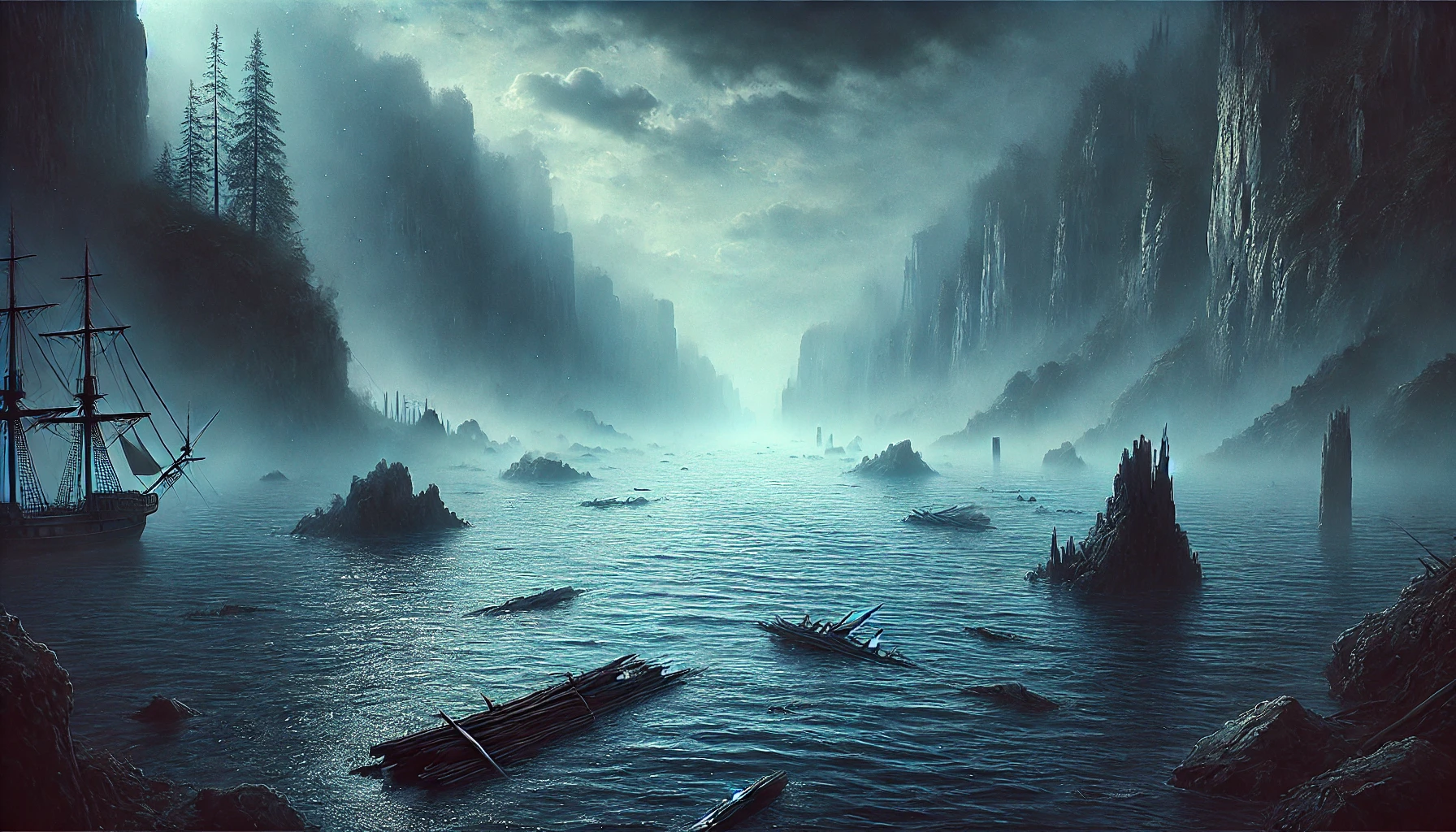 Caractéristiques naturelles. La rivière impose sa puissance. À plusieurs endroits, elle devient un véritable piège mortel, comme aux Roches Écarlates, où les flots se brisent contre des éperons de pierre rouge, ou à la Chute des Voiles, une cascade vertigineuse que nul navire n’a jamais franchie intact. La brume, née des marécages environnants, enveloppe souvent ses berges d’un manteau opaque, transformant les traversées en épreuves d’aveuglement et de patience. Plus elle progresse vers l’est, plus elle s’élargit, nourrie par des torrents venus des Collines Sanglantes, avant de se répandre enfin dans l’immensité scintillante de la Mer de Cristal.