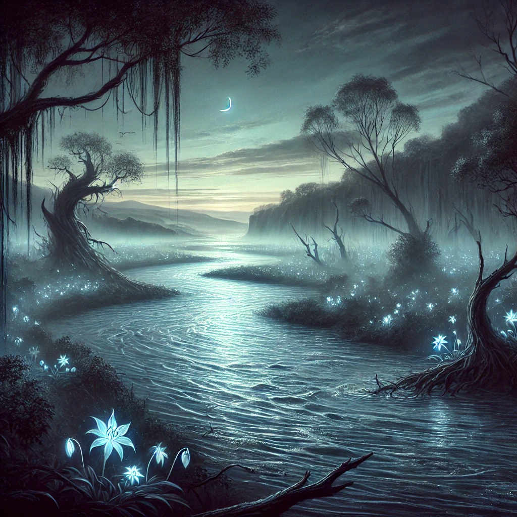 Faune et Flore. Les rives de la rivière sont bordées de saules pleureurs et de roseaux tandis que ses eaux sont remplies de lumnéas, des poissons argentés réputés pour leur saveur délicate et leur éclat luminescent. Également, les lys étoilés, des fleurs rares qui s’épanouissent uniquement au clair de lune, poussent près de ses berges.
