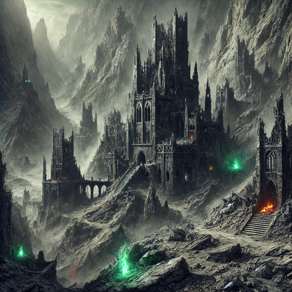 Histoire. Zarkâ-Angala, nécromancienne d’une puissance effroyable, s’était installée dans cette région au début du Deuxième Âge pour y fonder son sanctuaire de mort. Elle avait bâti son repaire dans une vallée encaissée, autrefois fertile, mais qu’elle transforma en un désert de cendres au fil de ses expériences occultes. Elle y éleva des armées de morts-vivants et imposa sa terreur sur la région jusqu’à ce que l'Ordre des Lames Blanches la traque et la mette à mort lors d’un combat épique. Sa chute fut si violente que le sol se fractura, engloutissant une partie de sa forteresse. Depuis, les ruines sont restées telles quelles : un monument aux horreurs de la magie noire et à la victoire de Kaernia sur l’une de ses plus grandes menaces.