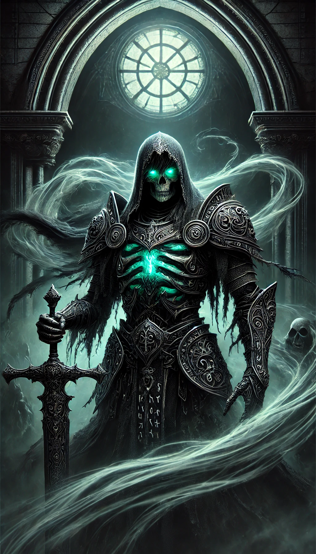 Apparence. Térand Valcarys est désormais une créature à la fois imposante et sinistre. Sa haute stature est drapée dans une armure noire incrustée de runes funèbres, dont les plaques semblent animées d’un éclat interne verdâtre. Ses yeux, deux orbes d’un bleu spectral, brûlent d’un feu glacé derrière un heaume ouvert, révélant un visage partiellement décharné, encore marqué par une beauté fanée et une noblesse cruelle. Une cape de brume, faite des âmes de ceux qu’il a trahis, l’enveloppe constamment, tourbillonnant autour de lui comme un vent de tombe. Son épée, Brisedevoir, est une lame maudite dont l’acier absorbe la lumière et les serments. On raconte qu’elle gémit à chaque coup porté, résonnant du désespoir des serments trahis.