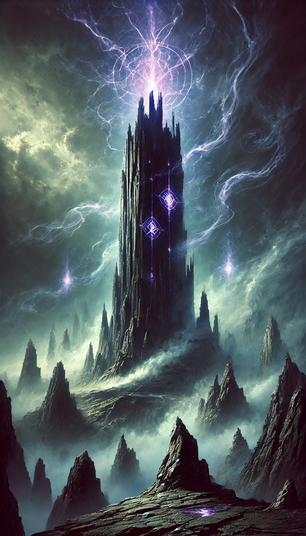 Description générale. Dressée sur un haut promontoire rocheux dominant les terres environnantes, la Tour de Raknâs est une silhouette élancée et inquiétante, se perdant dans des brumes surnaturelles qui ne se dissipent jamais. De loin, elle semble tantôt proche, tantôt lointaine, comme si sa position elle-même fluctuait dans l’espace. La tour, d’une hauteur vertigineuse, est construite en pierre noire veinée de reflets violacés, et ses parois sont incrustées de glyphes mouvants qui brillent par intermittence, comme s’ils respiraient au rythme d’un cœur invisible. On raconte que les brumes qui l’entourent ne sont pas naturelles, mais une création permanente de Raknâs lui-même, dissimulant son repaire et brouillant l’orientation des voyageurs imprudents.