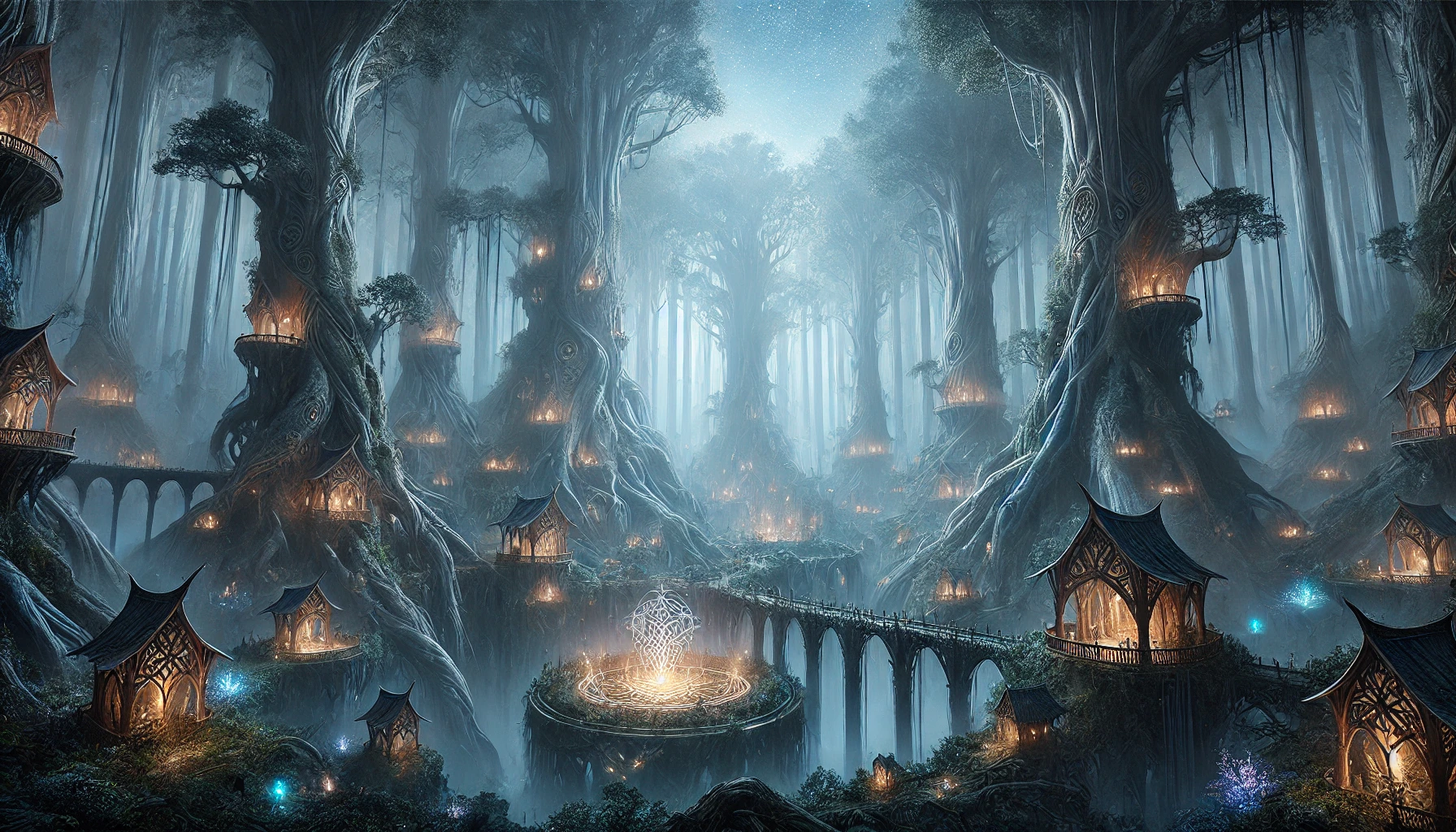 Description générale. Triste-Étoile est le repaire majestueux et secret des elfes de la Vieille Forêt , la demeure d’Aerilith et de sa lignée. Nichée au cœur de l’épaisseur sylvestre, là où même la lumière du soleil semble hésiter à entrer, cette cité forestière ne ressemble en rien aux brillantes cités de pierre de Sylvareth. Ici, la nature est la véritable muraille : arbres millénaires aux troncs larges comme des tours, lianes entrelacées formant des ponts vivants, et clairières baignées d’une lueur argentée qui ne se dévoile qu’aux initiés. Triste-Étoile est enveloppée en permanence d’une brume douce et surnaturelle, semblable à une nuit éternelle éclairée par des étoiles lointaines. Cette aura mystérieuse, qui lui a donné son nom, est issue d’anciens rituels exécutés par Aerilith lui-même après la chute de Gar-Galad, afin de masquer son royaume aux regards extérieurs.