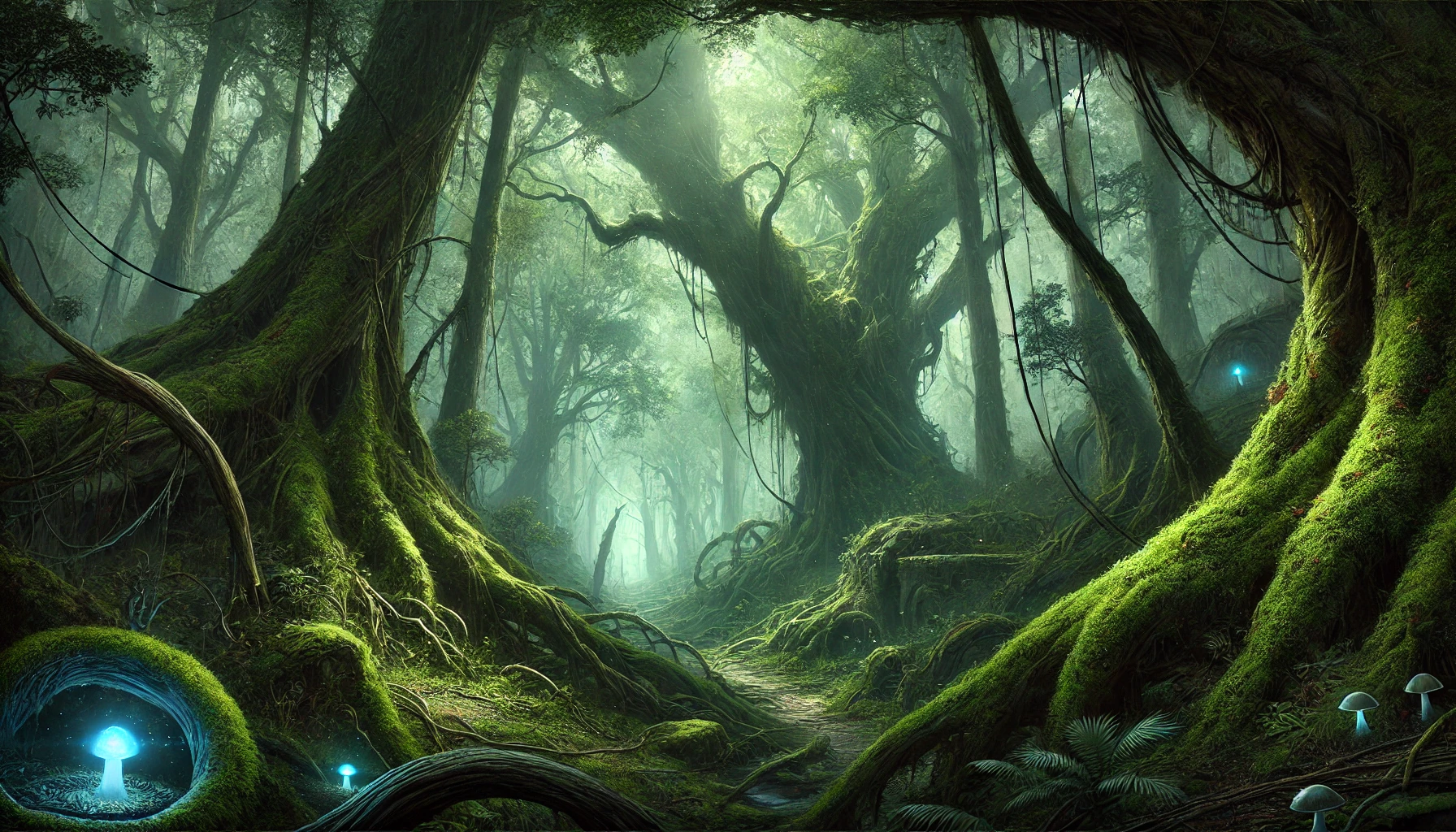 Caractéristiques naturelles. La végétation de la Vieille Forêt dépasse l’imaginaire. On y trouve des chênes millénaires aux troncs larges comme des tours, des saules aux branches luminescentes qui éclairent les sentiers, et des pins immenses dont les cimes se perdent dans les nuages. Certaines clairières recèlent des cercles de champignons ou de menhirs où la magie est si dense que la réalité semble vaciller. La faune y est abondante et souvent empreinte de mysticisme : cerfs aux bois argentés, hiboux géants aux yeux de braise, meutes de loups intelligents, ainsi que des esprits sylvestres prenant parfois forme animale. La magie est partout, imprégnant le sol, l’air et les rivières. Le climat y est humide et doux, mais capricieux : des brumes épaisses peuvent surgir sans prévenir et masquer le monde entier, renforçant la réputation labyrinthique de la forêt.