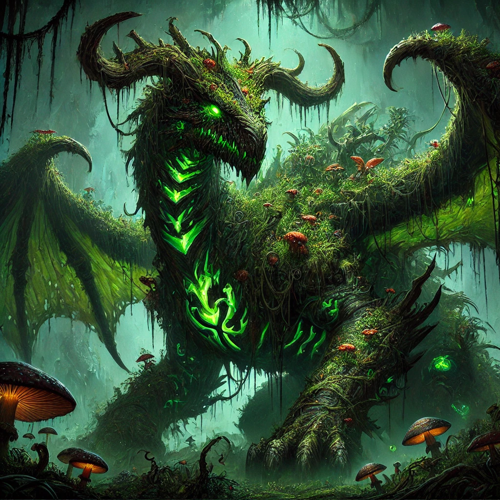 Apparence. Zarrakh’Thul est d’une taille colossale, dépassant les dimensions ordinaires même pour un dragon très ancien. Son corps est couvert d’écailles vert sombre striées de veines phosphorescentes, comme si une sève empoisonnée circulait sous sa peau. Des branches, des champignons géants, des ronces et même des fleurs toxiques ont poussé sur son dos, rendant sa silhouette indiscernable dans la jungle. Ses yeux, deux sphères dorées traversées d’une pupille reptilienne noire, voient à travers le mensonge, la magie, et les illusions. Son souffle, loin d’être un simple nuage de poison, est un brouillard de corruption vivante : toute chose vivante prise dans son souffle pourrit, se contorsionne, puis renaît sous forme de créature mutée, servante végétale ou abomination reptilienne. Ce souffle est surnommé par les survivants « l’Haleine-Fournaise des Ruches Putrides ».