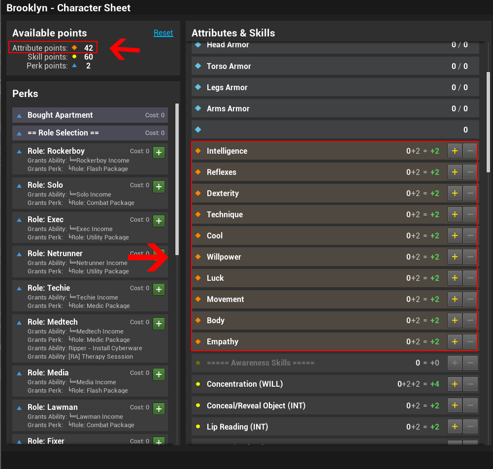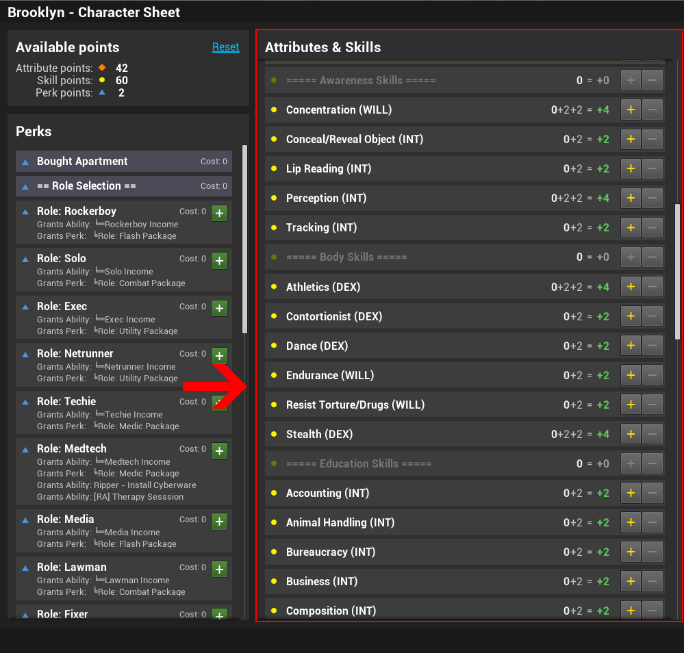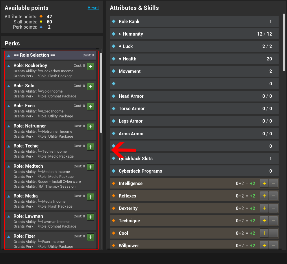 Each Role represents your archetype/class, your place in the ecosystem of Night City. Every role offers a unique ability, income type and extra bonuses to skills related to their role.