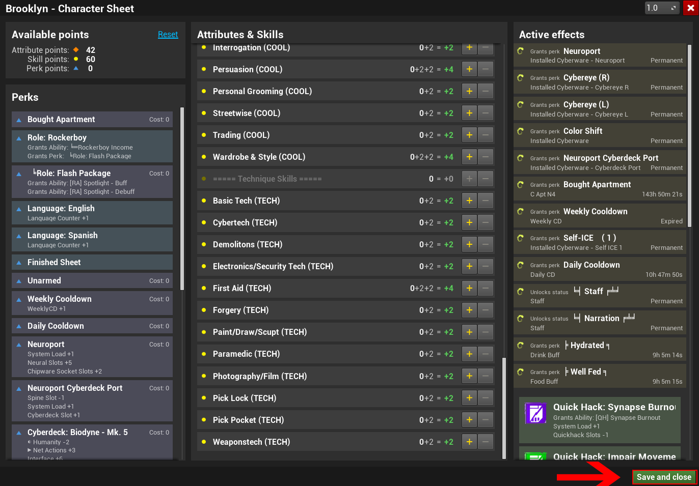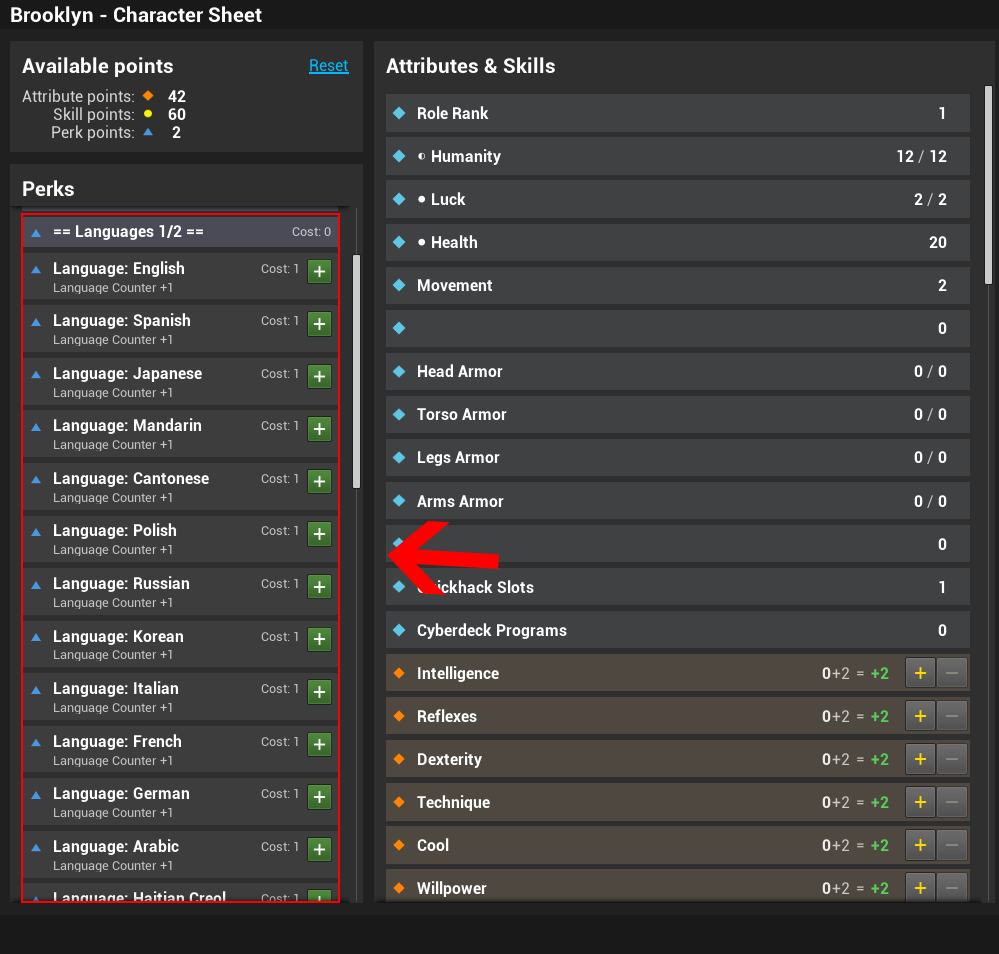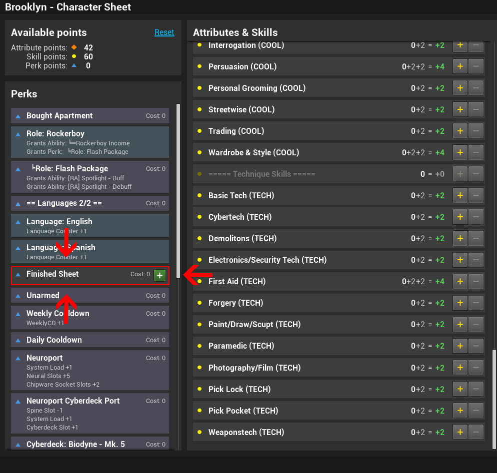Once your stats, skills, and languages are set, make sure to select the Finished Sheet perk. Without it, you can’t leave spawn.