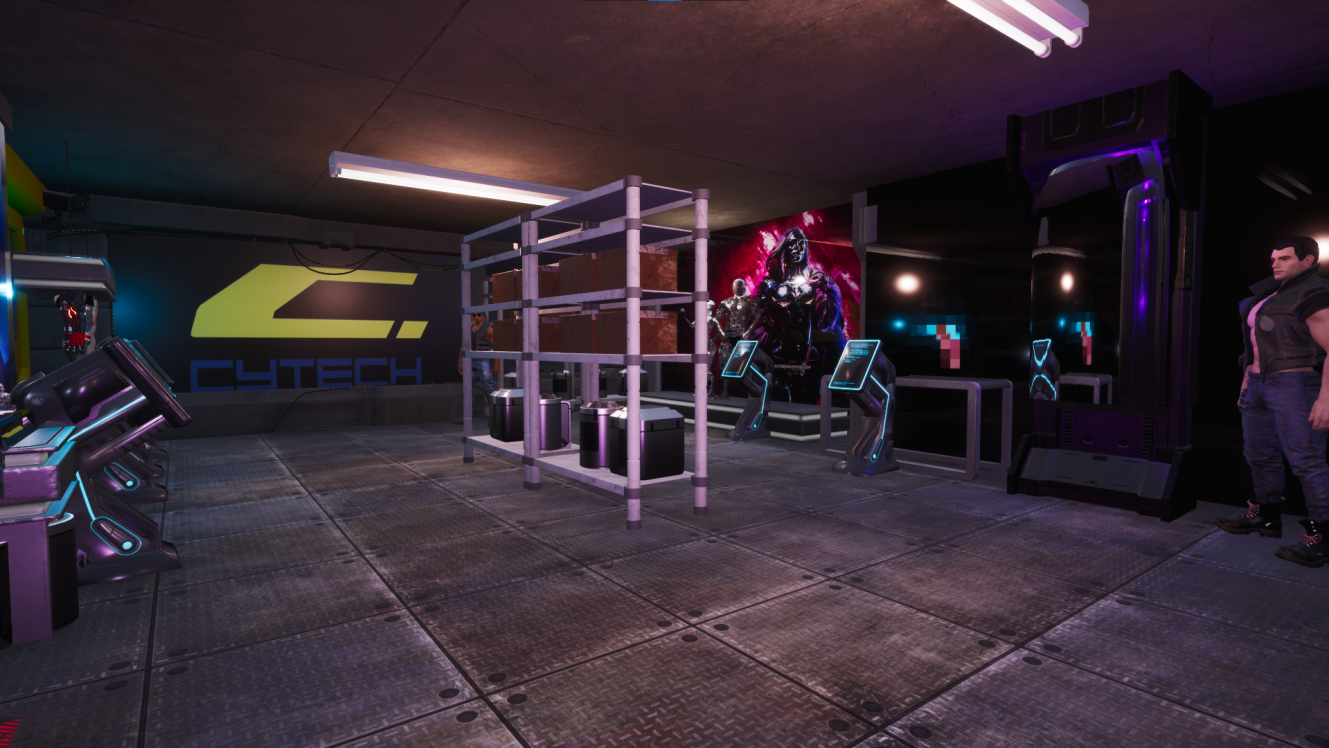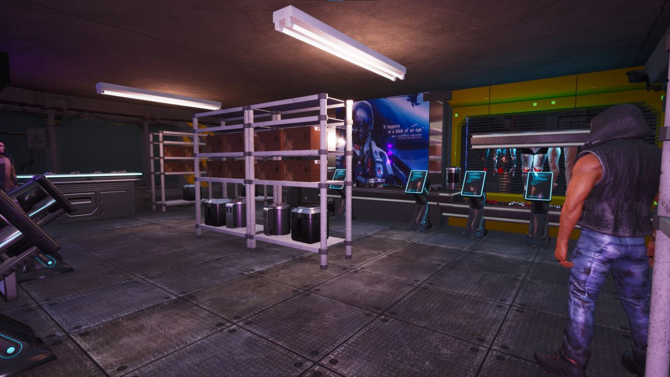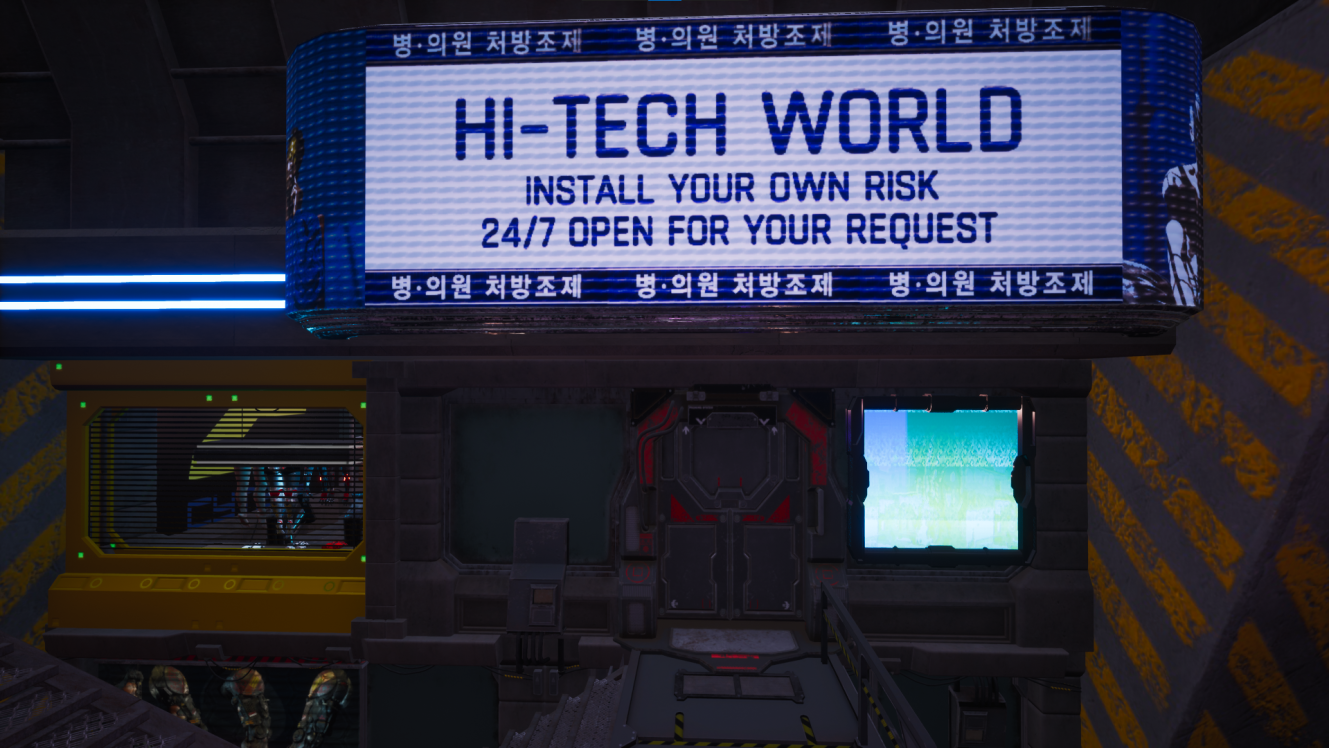 Hi-Tech World is a glowing shrine to augmentation culture, equal parts retail hub and cautionary tale. With hazard-striped walls, flickering terminals, and kiosks that promise transformation “at your own risk,” the shop captures the tension between progress and peril. From the CYTECH exhibition space to the stacked shelves of neural mods, every corner pulses with the promise of reinvention. Just don’t expect installation on-site, you’ll need to find a cyberdoc to finish the job.