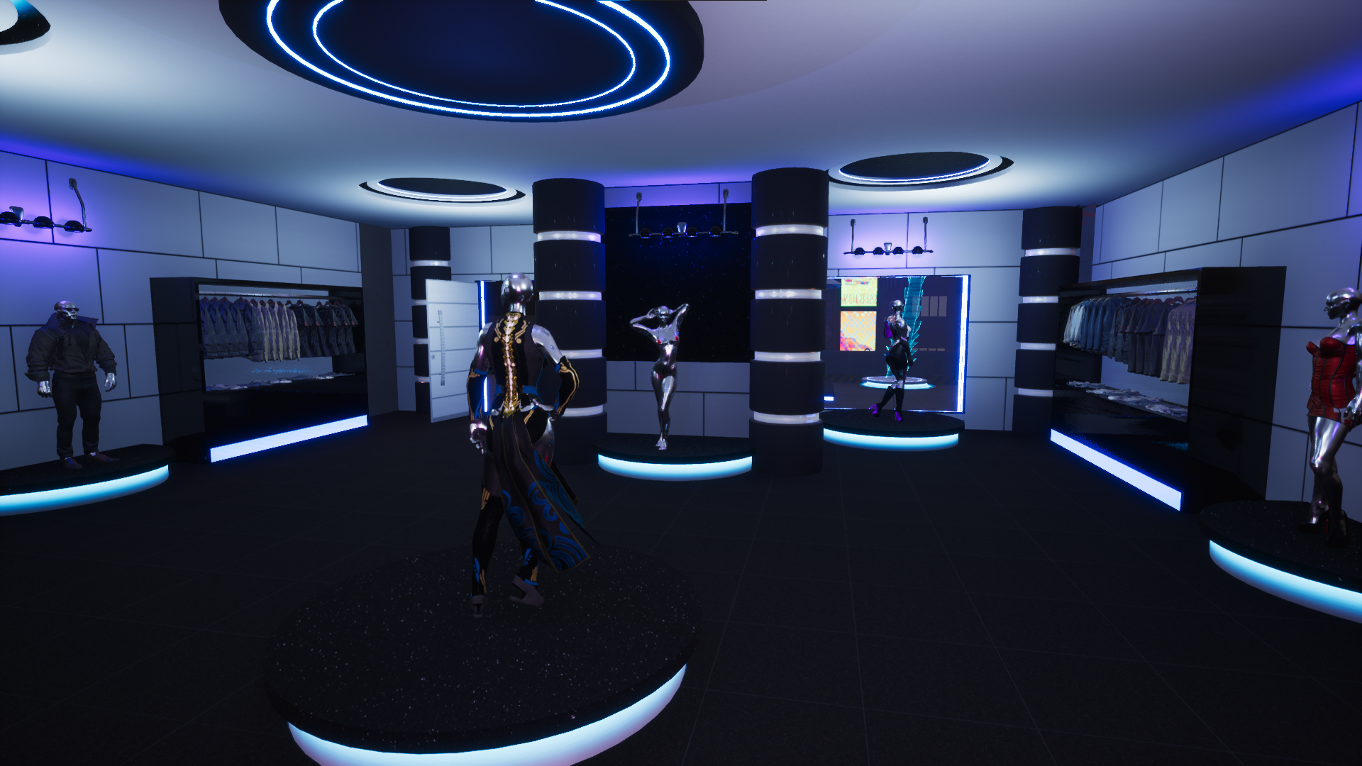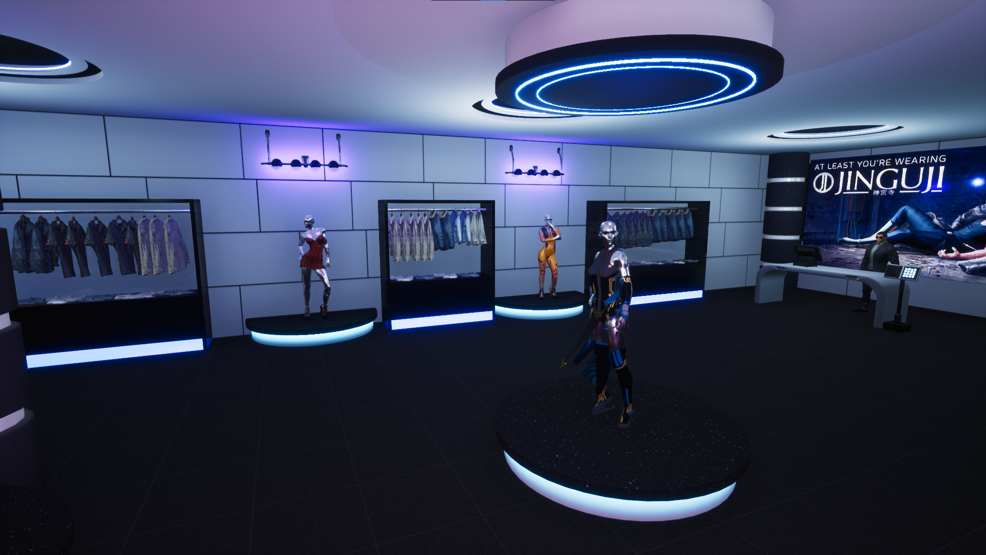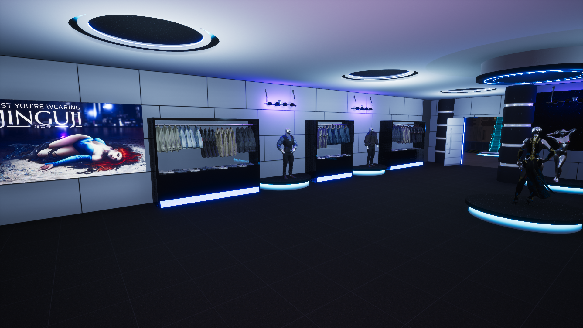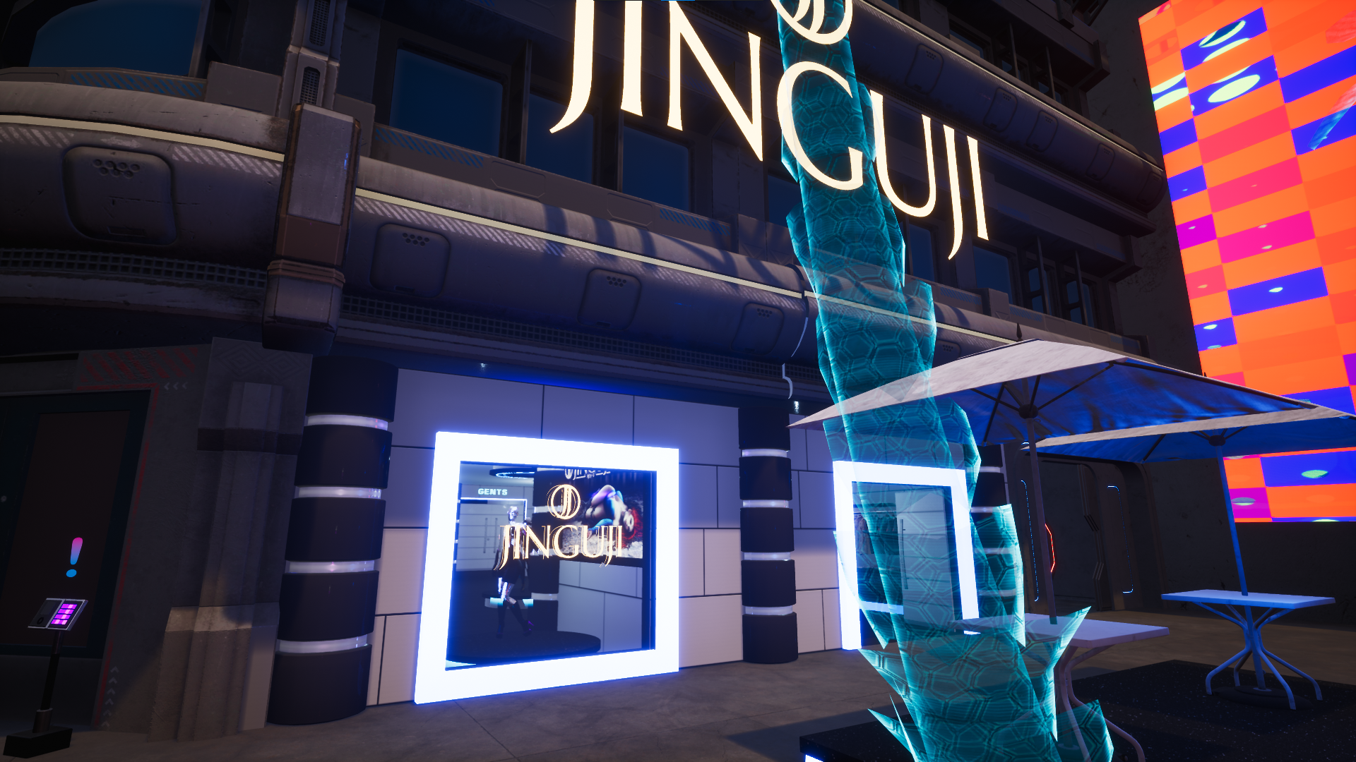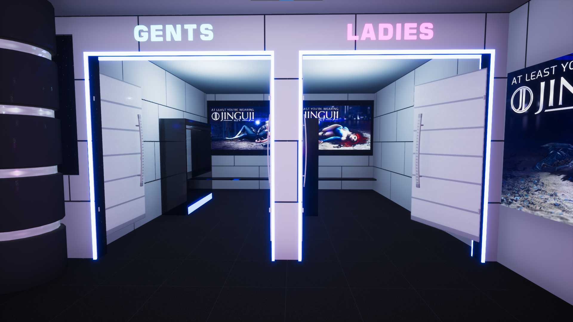 Jinguji is the pinnacle of corpo fashion, sleek, exclusive, and unapologetically dramatic. Mannequins pose on illuminated platforms beneath circular light fixtures, surrounded by cases of curated garments. Digital ads flash slogans like “At least you’re wearing Jinguji,” blending luxury with existential flair. Even the dressing rooms double as brand showcases, wrapped in glowing signage and stylized media that remind you: image is everything in Night City.