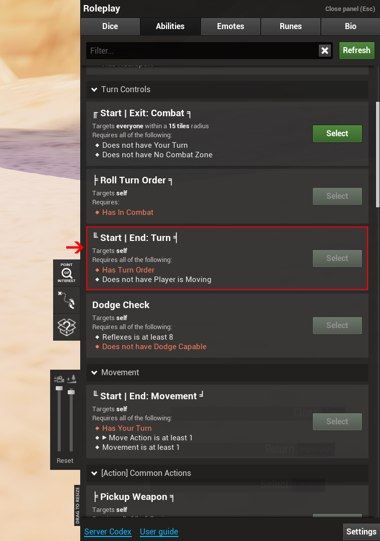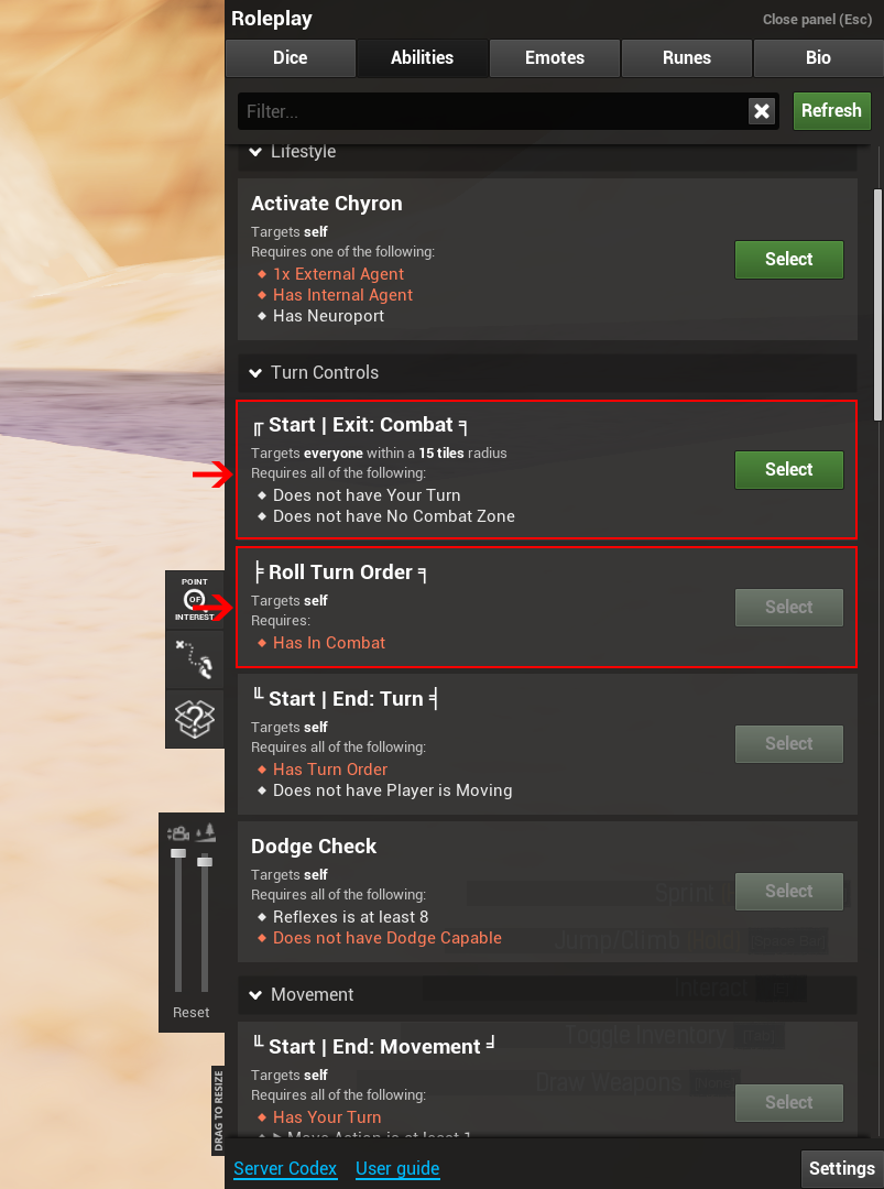 This will automatically roll initiative for you, as well as alert anybody within fifteen tiles that combat has started! The highest number goes first; reroll any ties.