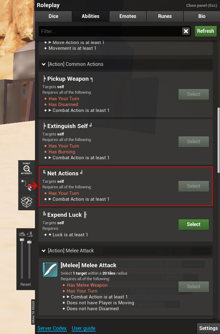 - Press 'net actions' to trade combat action for net actions.