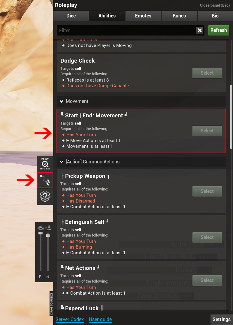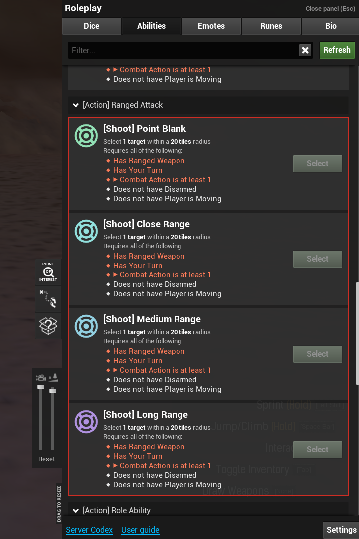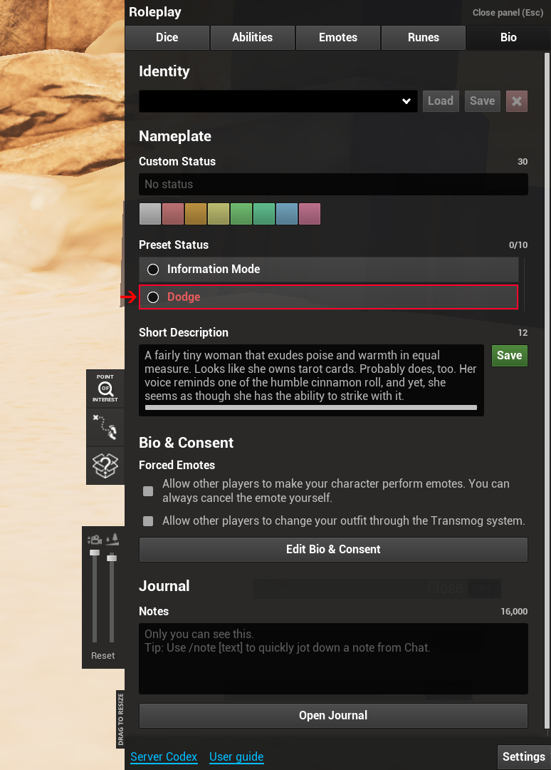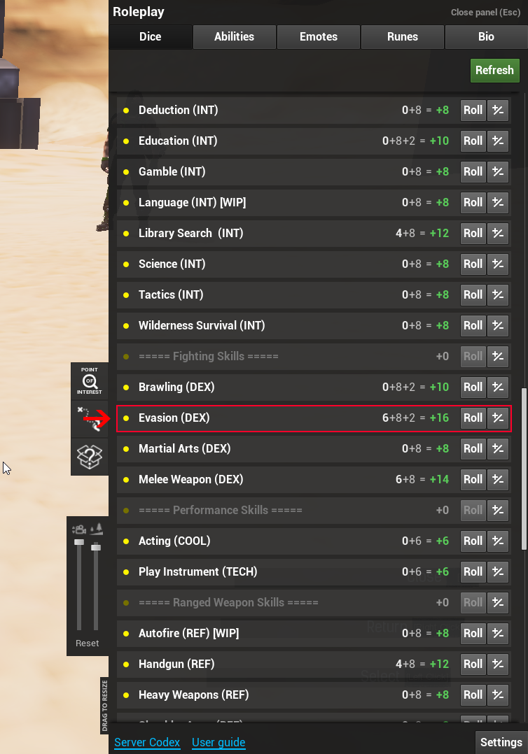- Toggle whether you attempt to dodge ranged attacks using the Evasion skill.