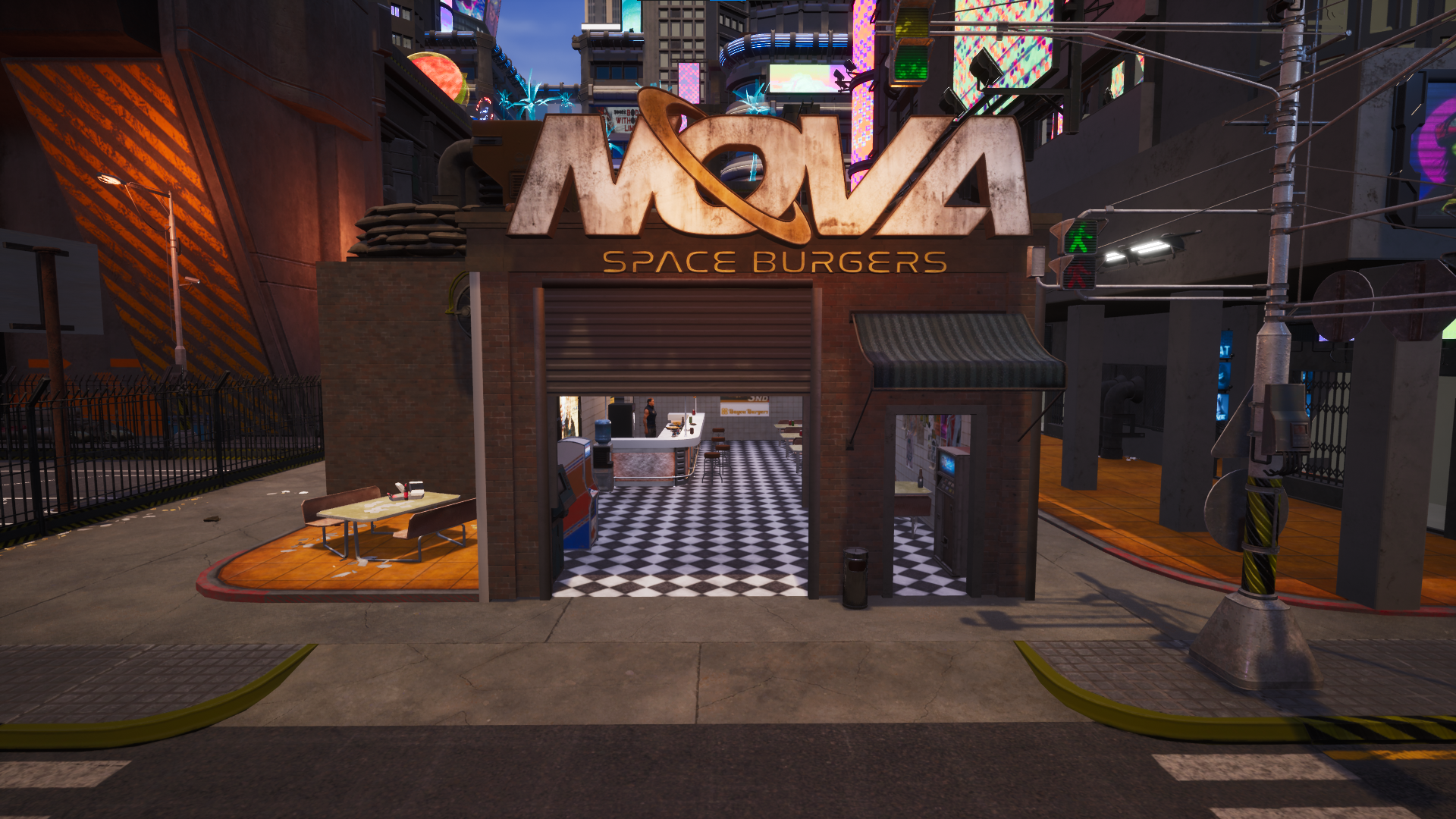 Nova Burger is a retro-futurist gem tucked into the urban sprawl, a place where synth-meat meets synthwave. With black-and-white checkered floors, neon signage, and red vinyl booths, it channels classic diner energy through a cyberpunk lens. Arcade machines hum beside condiment-stained tables, while the kitchen glows behind a counter lined with glowing menu boards. Whether you’re grabbing a burger or just soaking in the nostalgia, Nova Burger is a slice of comfort in a city that rarely offers any.