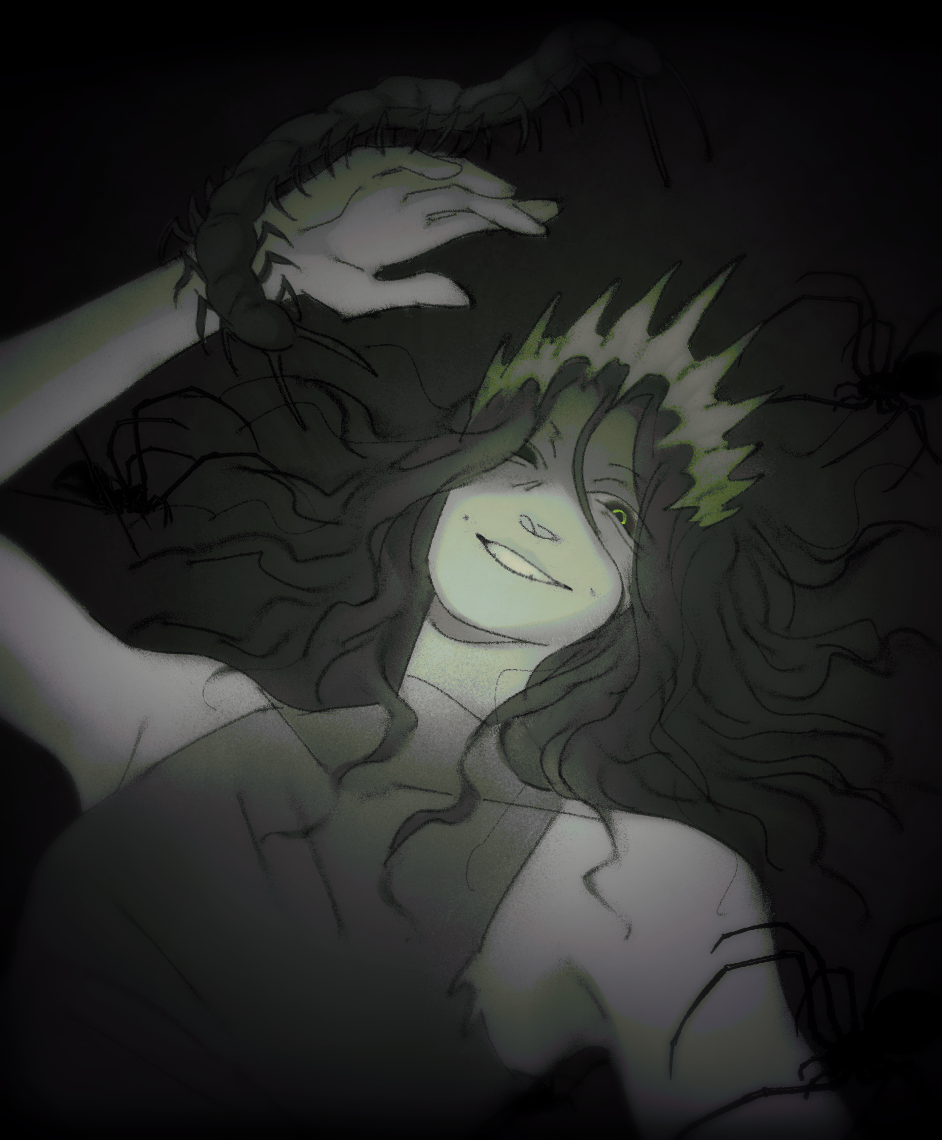 She dresses in mismatched necromantic robes and constantly has slugs and other repulsive creatures crawling on her. She sometimes wears crowns of crystalized vomit.