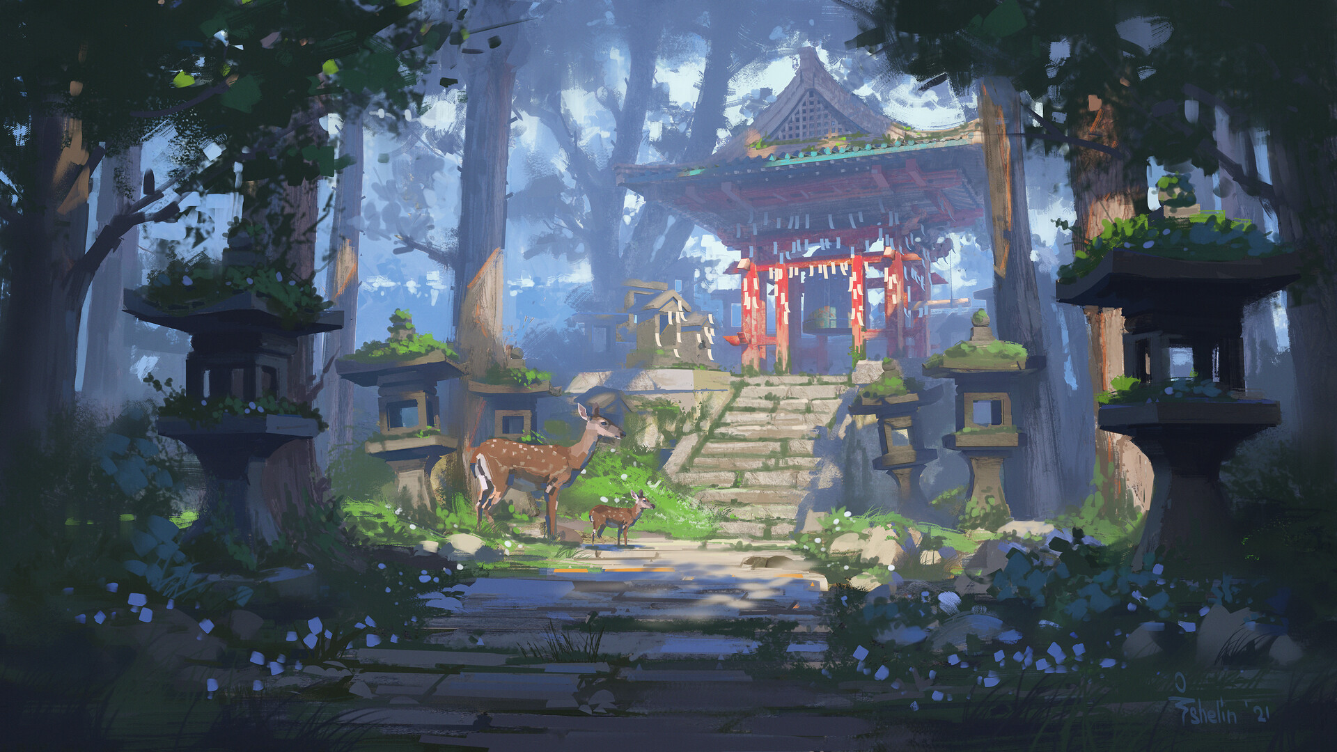Nestled in a grove of the Pink River Forest, an ancestral shrine stands as a symbol of tradition and fortune to the local clans. Also known as the North Cat Shrine, the shrine is said to grant good fortune and healing to those who visit. Every so often, villagers and clan folk who call the forest home will come to the shrine, often as a family, to leave offerings and meditate on the emblems. Crafting things in the vicinity is said to bless the finished product if one sees the cat spirit of the shrine while working. The forest's famous pink crystals seem to appear with more frequency in the grounds of the shrine. Each clan has its own views as to the origins of the shrine, but most agree that it represents an ancestor or hero of the northern Catfolk clans. The spirit inhabiting the shrine is said to be fond of watching pilgrims and imitating their motions, especially children. It's not uncommon for clan kits to report seeing the spirit while elders lament never having seen a thing. Regardless of clan differences at any given moment, the shrine is meant to be neutral territory. To ensure this, the shrine maiden is always a Catfolk with no clan connections or one who has renounced them.