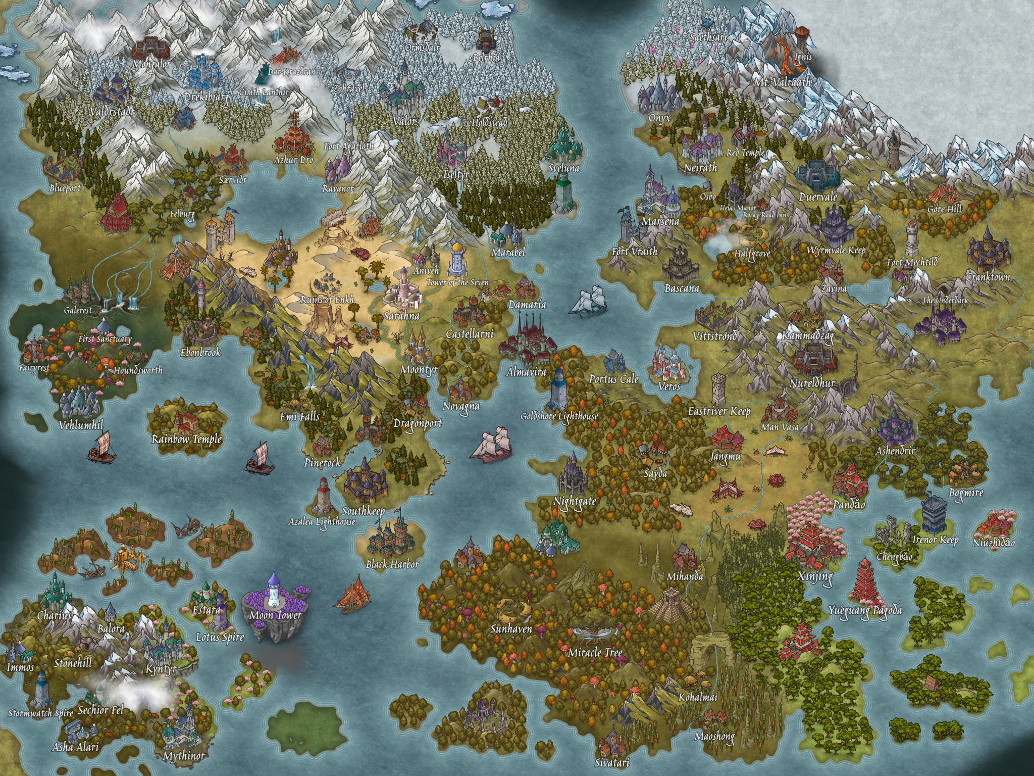 The continent of Sol is a large landmass, as well as some islands, to the northeast of Elysium and the west of Urai. A deeply diverse continent, it is home to a wide variety of races, creatures, flora, fauna, and biomes. The northern reaches of the continent feature arctic tundra, mountain ranges, and boreal forests, populated by rugged folk and small tribes. Further south, the climate gets warmer and the land more fertile, except for a great desert in the western region. This land gives way to lush forests, rolling hills, and settlements dotting the coastline and rivers. The southernmost regions of Sol give way to thick forests and vast jungles, interspersed with pockets of fey influence, often in dispute between civilization and outlanders. Throughout Sol, mortals have braved even the harshest reaches to carve out a life for themselves. Though the settlements, communities, and nations of the continent are in constant trade and conflict with each other, they tend to interact very little with their neighbors to the east and west. Exploration has been considered dangerous and usually fruitless, as sea voyages often lead such pioneers to ruin. The continents beyond their realm remain a mystery to most of the continent.