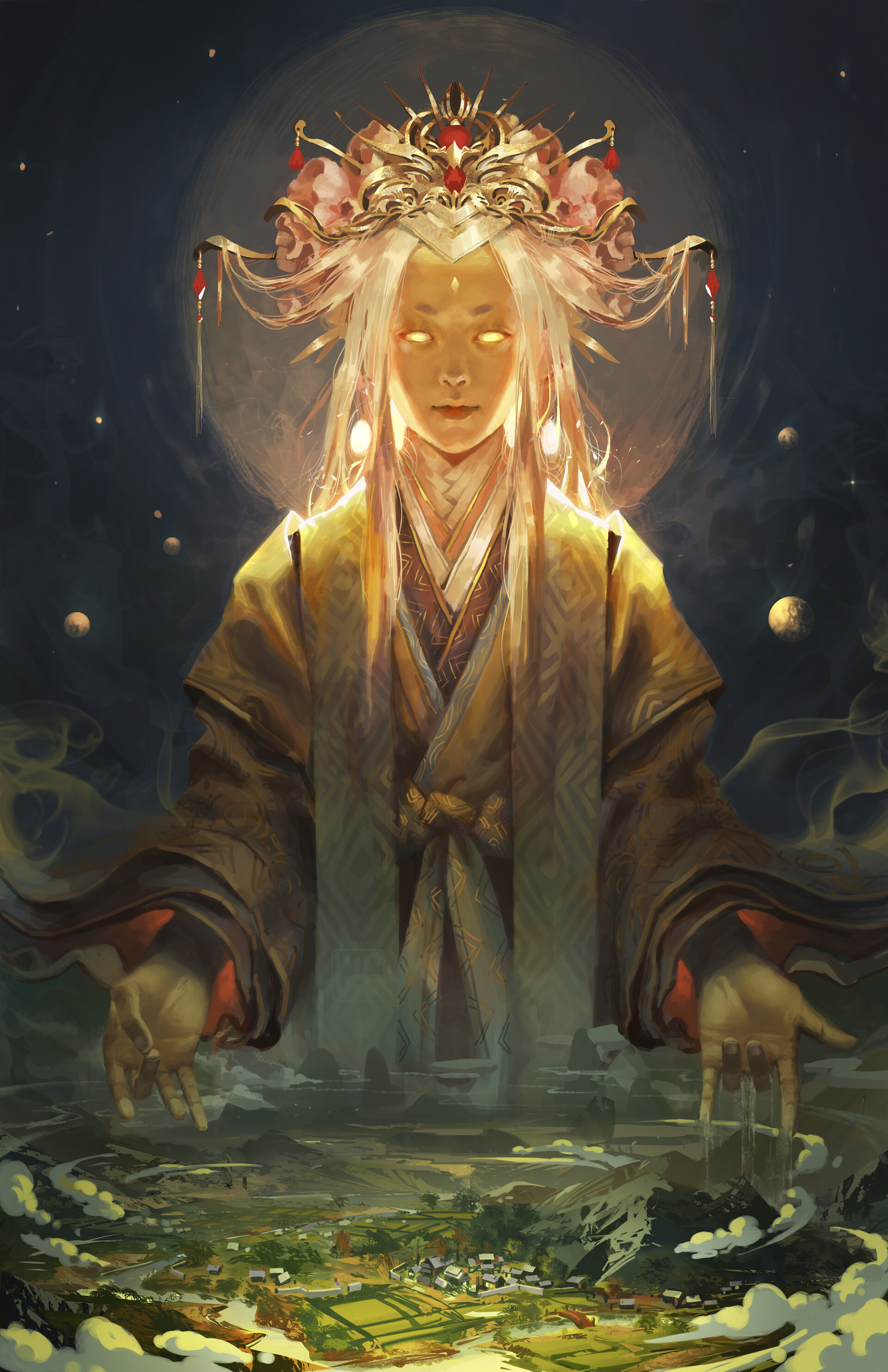 First created of all divine beings, Yuna is the Twin of Dawn, created together with Luna, the Twin of Dusk. In contrast to their twin, Yuna represents light, order, stasis, and good. They are associated with the sun, renewal, life, water, earth, and daybreak. Yuna is adorned in the comforting warmth of radiant sunlight and divine luminosity, often depicted as a gentle spirit of divine light or a radiant saint, always of neutral gender expression. When Yuna appear before mortals, those who stand before the Twin of Dawn may bask in their comforting light. Despite the tendency of the Ten Divines to interact very little in mortal affairs, Yuna remains as one of the more popular deities of the primordial pantheon, inspiring many cults, religions, and holy orders dedicated to their ideals of light, life, and truth.The Seed of Civilization
