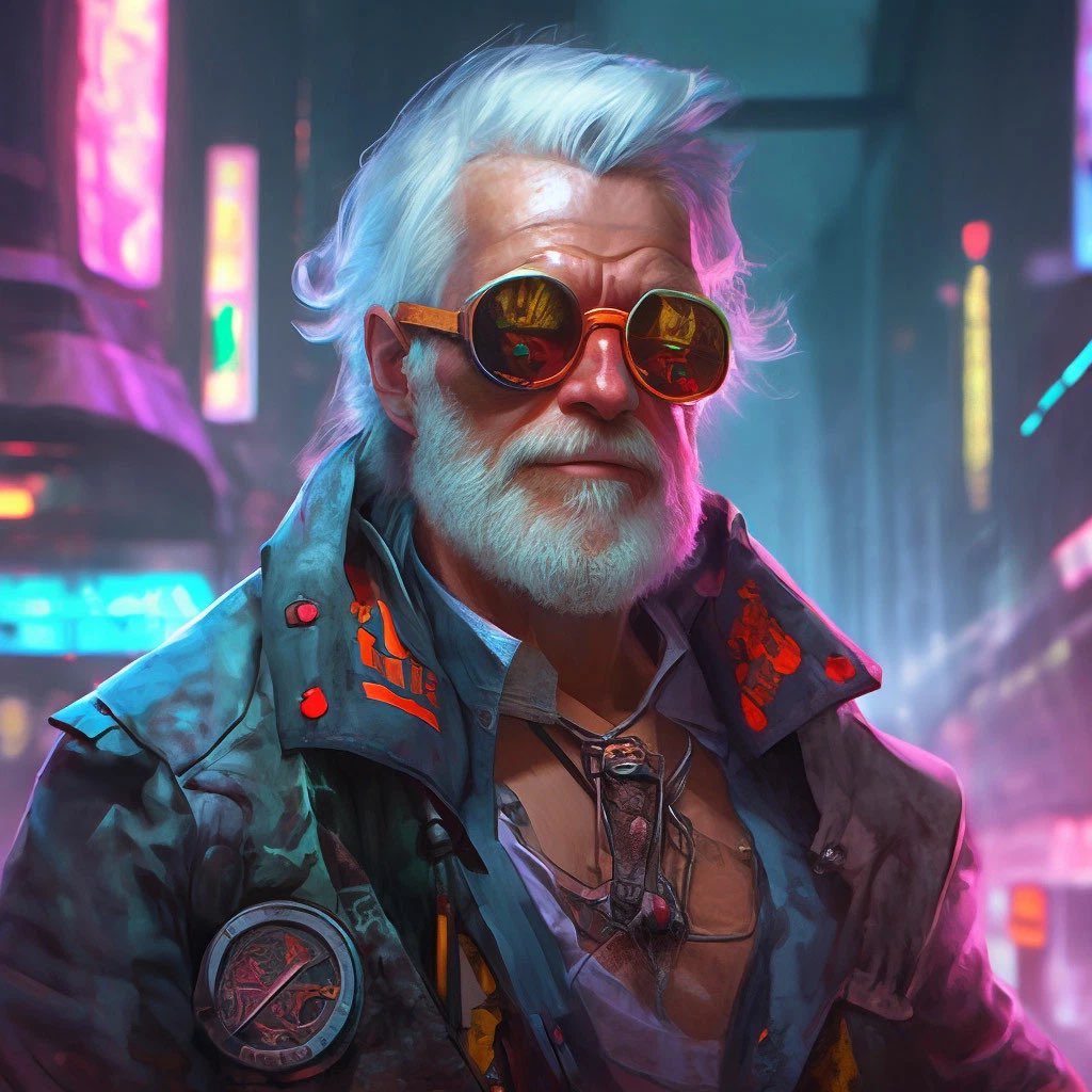White hair swept back in a wind that isn’t there, beard neatly trimmed instead of letting it go wild—he’s made peace with age, but he refuses to look fragile. His skin is weathered, lined at the eyes and brow, the way you get from squinting into too many neon nights and not enough sun.