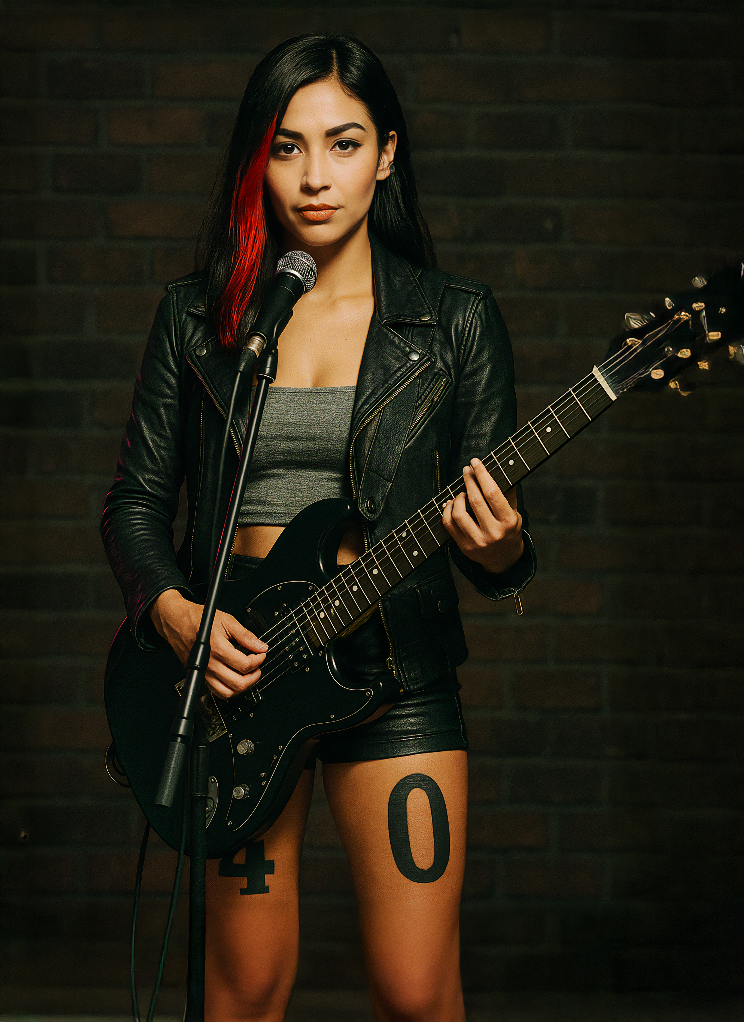 Julia “Forty” Dore is the fiercely independent frontwoman of the band Forty, a singer-guitarist with a voice that can cut through any dive-bar noise. Her most striking features are a four and a zero tattooed above her knees, and a single lock of hair dyed fire-engine red.