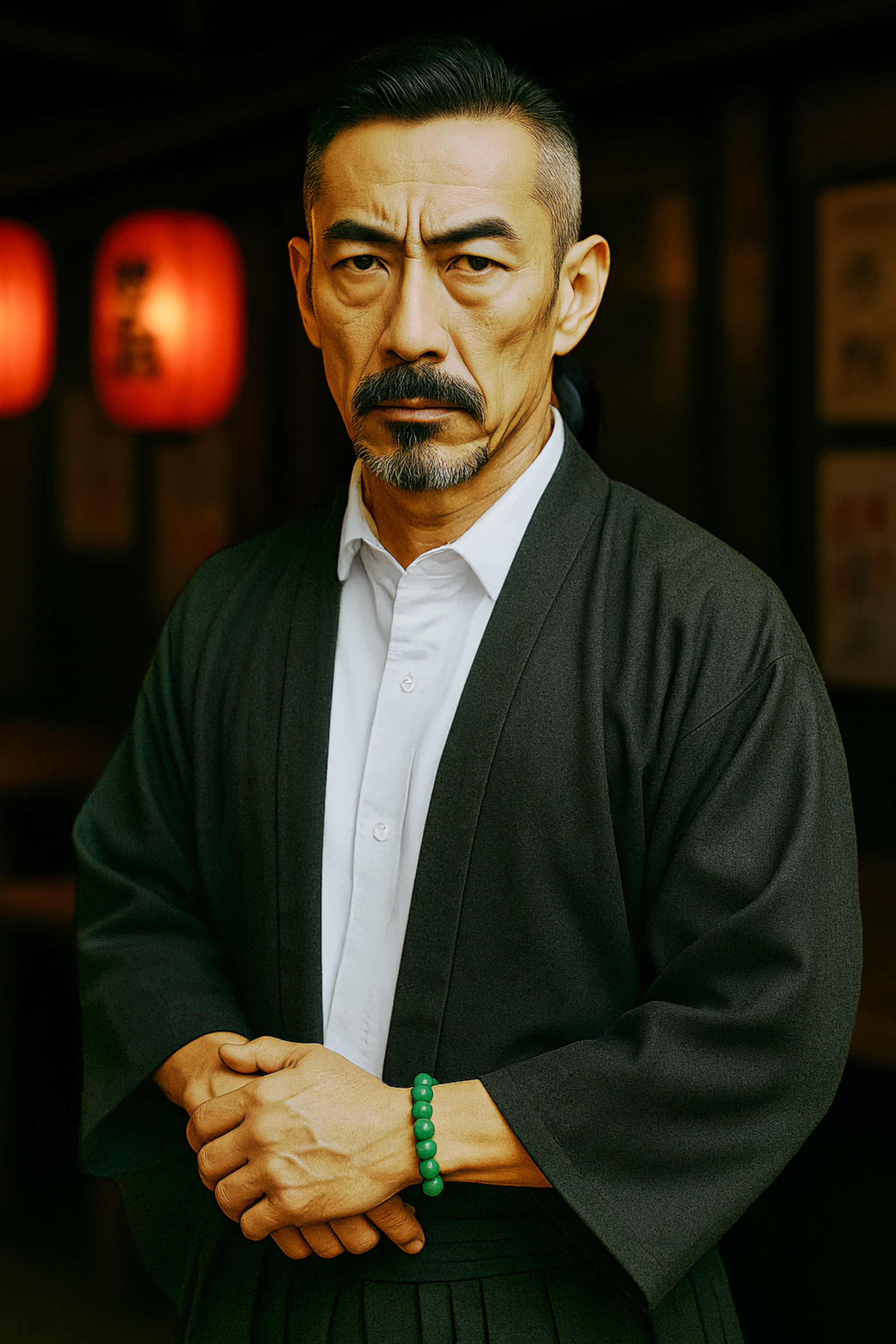 Renji Takagawa often spends evenings at The Last Drop, sitting in a booth by the far wall with a clear line of sight to the entrance. He never orders alcohol—just green tea, prepared properly, no matter who’s working. The staff never mess it up. They know better. He sips in silence, his expression unreadable, but those who watch him long enough feel the gravity he carries. He rarely speaks. He always listens. The regular patrons may refer to him as just "Takagawa-san" or "Old Renji," though he's not especially old.