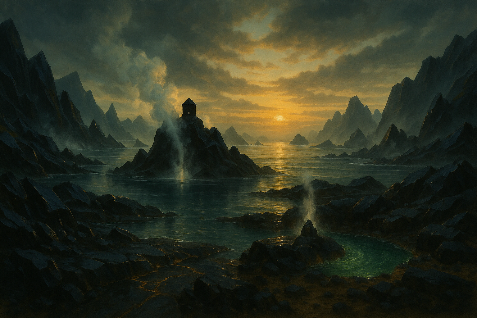 Askraholm ist ein Ort von kalter, unwirklicher Schönheit – ein Archipel aus scharfkantigen Inseln, geformt aus schwarzem Basalt und gläsernem Stein. Im Westen von Isfjorr gelegen, markiert es den Rand zwischen Feuer und Meer. Wenn die Sonne über dem Ozean steht, funkeln die Felsen wie geschmolzenes Metall, und das Wasser scheint selbst Rauch zu atmen. In den Nächten glimmt die Gischt grünlich, als ruhe im Ozean ein altes Feuer, das niemals erlischt. So wird Askraholm zum äußersten Atemzug des Landes – ein Grenzort, an dem das Feuer der Tiefe den Ozean berührt.