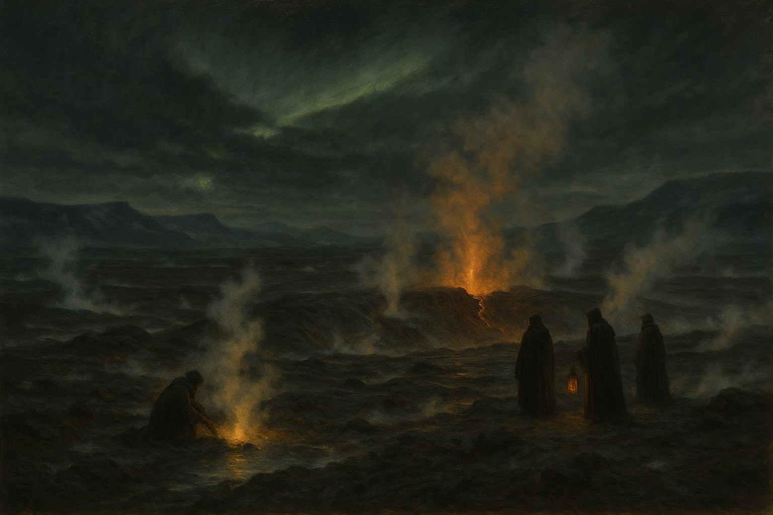 Die Pilger erzählen, dass in Nächten der größten Kälte die Polarlichter über den Kratern tanzen und Gardnars Schatten durch das Licht wandelt – ein Zeichen dafür, dass das Feuer nie schläft. Manche schreiben Runen in den Schnee und warten, bis der Wind sie fortträgt, um zu sehen, welche Zeichen zurückbleiben. Andere stellen Gefäße über dampfende Quellen und lauschen dem Klang des aufsteigenden Dampfes, als spräche die Erde selbst.