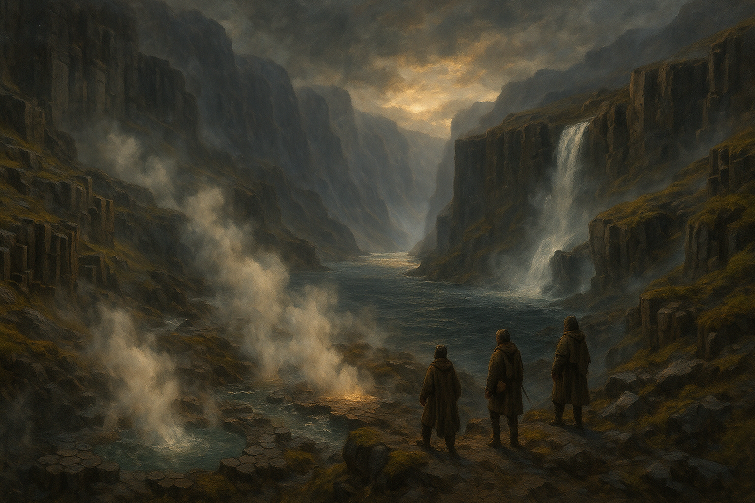 Die Basaltfjorde sind ein Reich aus Stein und Schwaden – ein Land, in dem Feuer und Meer seit Anbeginn miteinander ringen. Wie Narben schneiden sich die Fjorde tief in das schwarze Gestein, umrahmt von Klippen, die im Sonnenlicht metallisch glimmen. Nebel ruht auf dem Wasser wie ein atmender Schleier, und der Wind trägt den salzigen Geruch von Regen, Schwefel und Glut.