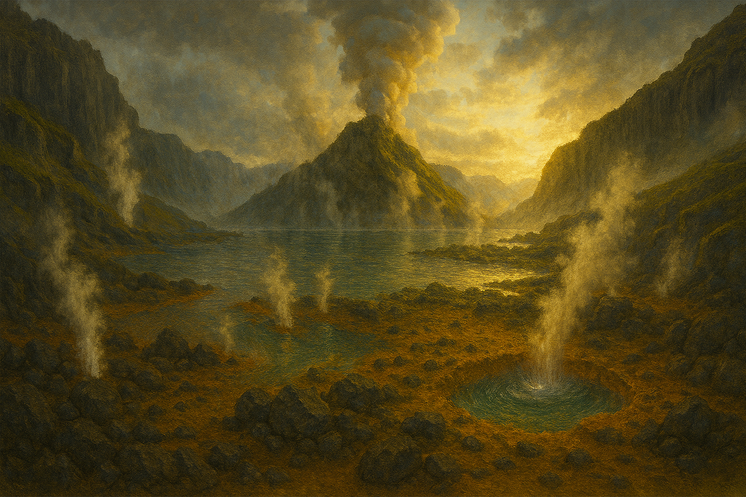 Im Sommer flirrt die Luft wie geschmolzener Bernstein, in der Ferne tanzen Blitze zwischen den Säulen aus Basalt. Im Winter hängt ein schwefliger Dunst über dem Wasser, und der Schnee, der fällt, schmilzt noch im Flug – zu Dampf, der wie Geisterhand über das Meer zieht. Wer hier lebt, kennt keine Stille, denn selbst die Nächte tragen den Pulsschlag des Fjords in sich: das ferne Grollen der Tiefe und das zischende Lied der Winde.
