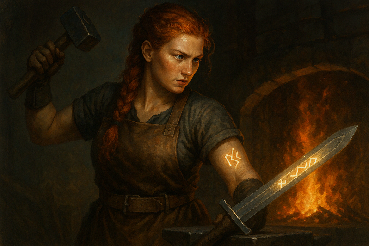 Brynja kämpft mit Hammer und Zeichen gleichermaßen – sie schlägt Runen in Stahl, während Funken wie kleine Sonnen über ihre Haut tanzen.