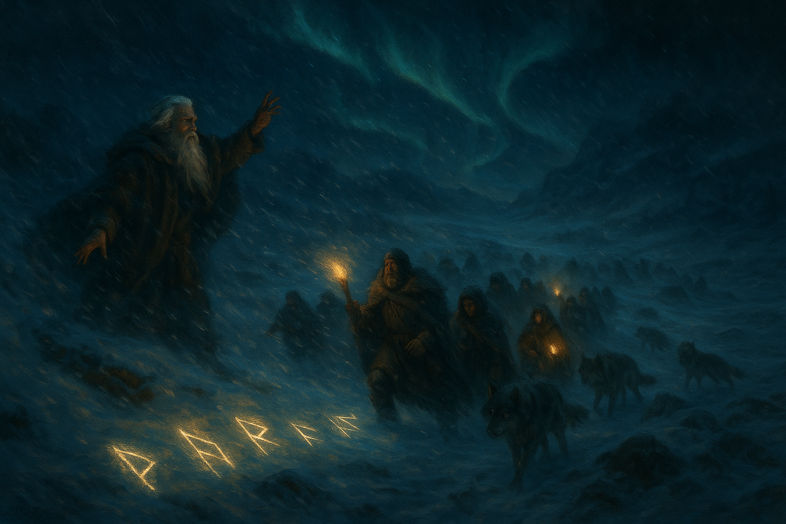 Arvund, der weise Runenschreiber, stand abseits, den Blick in die tanzende Dunkelheit gerichtet. Seine Augen suchten das Chaos, als ob er darin eine Ordnung erkennen könnte, die anderen verborgen blieb. „Hört auf den Schnee!“ rief er, seine Stimme schnitt durch das Heulen der Winde. „Die Götter sind hier. Sie sprechen zu uns.“