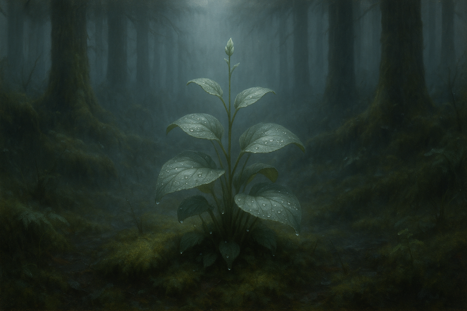 Dimhjerte wächst verborgen in den feuchten Lichtungen des Waldes, wo dichter Nebel die Erde umhüllt und die Luft schwer von Feuchtigkeit ist. Ihre silbrigen Blätter reflektieren das diffuse Licht des Morgens, wodurch sie in der Dämmerung fast zu leuchten scheinen. Die Oberfläche der Blätter ist mit feinen Härchen bedeckt, die winzige Wassertröpfchen aus der Luft einfangen und sie langsam in das Innere der Pflanze leiten. Ihr Wurzelwerk bleibt unter einer dicken Moosschicht verborgen und breitet sich weit aus, um die versteckten Wasseradern tief im Boden zu erreichen. Trotz ihrer zarten Erscheinung besitzt sie eine außergewöhnliche Widerstandskraft, die sie an das feuchte Waldklima anpasst.